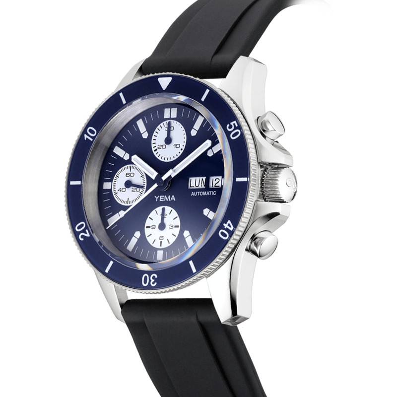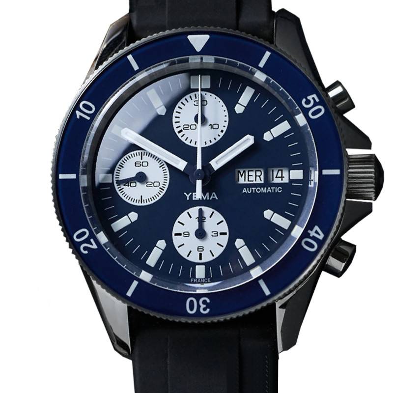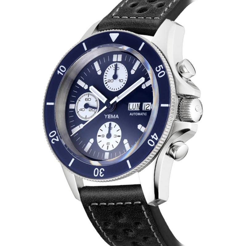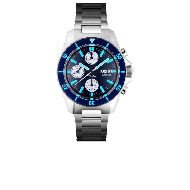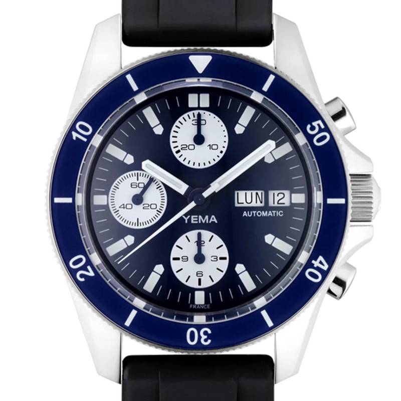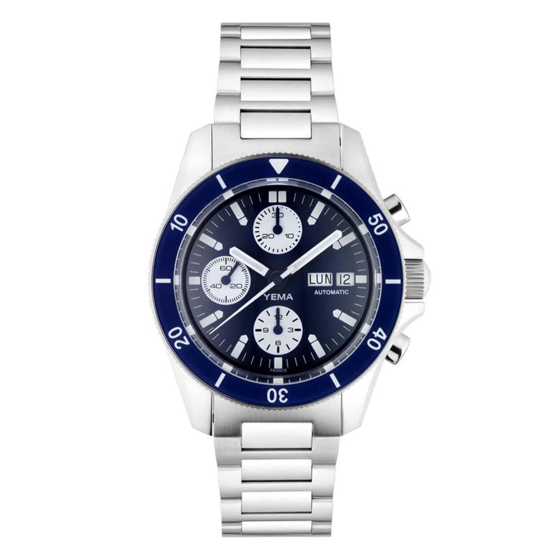 Yema a su marquer l'univers horloger mondial avec ses montres esthétiques. Ses modèles s'inspirent du secteur de l'aviation et sont assemblés avec précision dans les ateliers français par des experts dans le domaine. Yema vous dévoile aujourd'hui cette Navygraf Chrono de référence YNAV22CH.FR. Cette montre arbore un boîtier rond en acier inoxydable 316L d'un effet poli. Son diamètre de 40 millimètres et son épaisseur de 13.9 millimètres en font un garde-temps typiquement adapté aux poignets masculins. Un verre saphir bombé de 1.80 millimètres d'épaisseur est placé sur ce boîtier argenté, il protégera efficacement le cadran contre les rayures et les chocs du quotidien pouvant lui nuire. Ce boîtier se pare d'une lunette saphir bleue bidirectionnelle et cannelée résistante aux rayures. Marquée par des graduations en chiffres arabes allant de 0 à 60, vous pourrez l'utiliser même en milieux obscurs grâce à leur traitement super-lumiNova BGW9 grade A. Deux boutons-poussoirs et une couronne crantée parée par le logo embossé sont présents sur la droite de ce garde-temps. Ceux-ci permettront de mettre en marche et de régler ses différentes fonctionnalités. Sur le fond de boîte vissé, se trouvent certaines fonctions qui caractérisent cette Navygraf. Gravé par le blason historique de la marque à la presse hydraulique, il assure une étanchéité de 10 ATM.