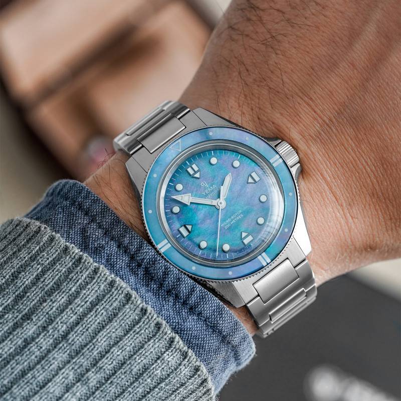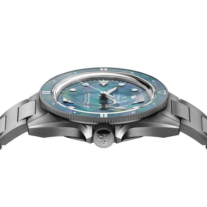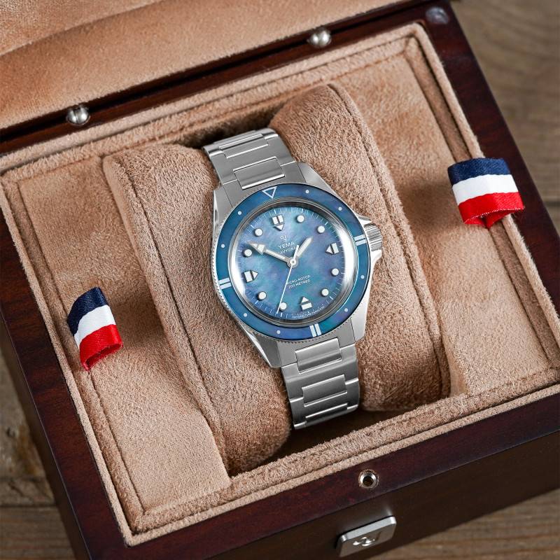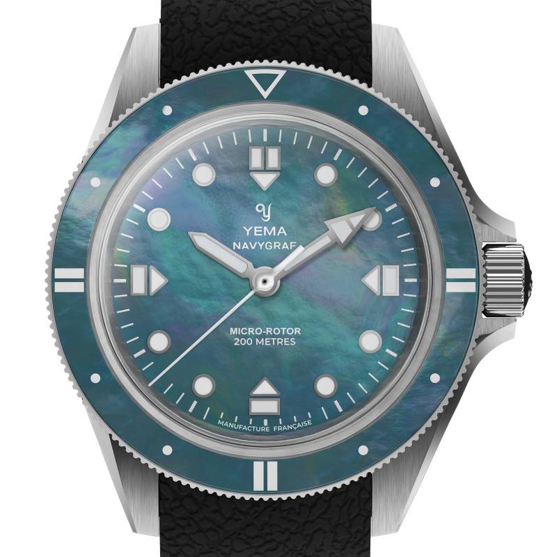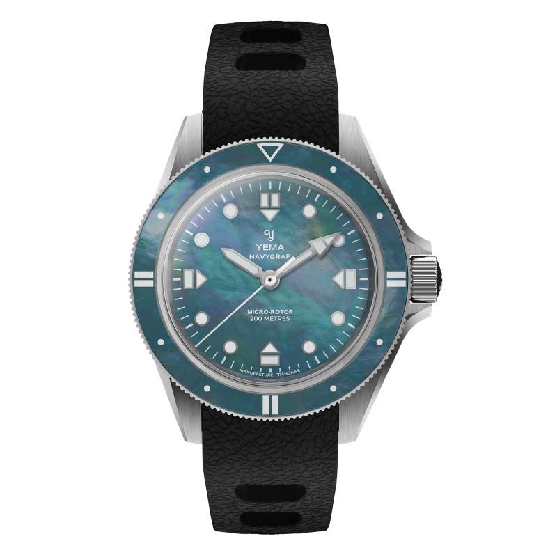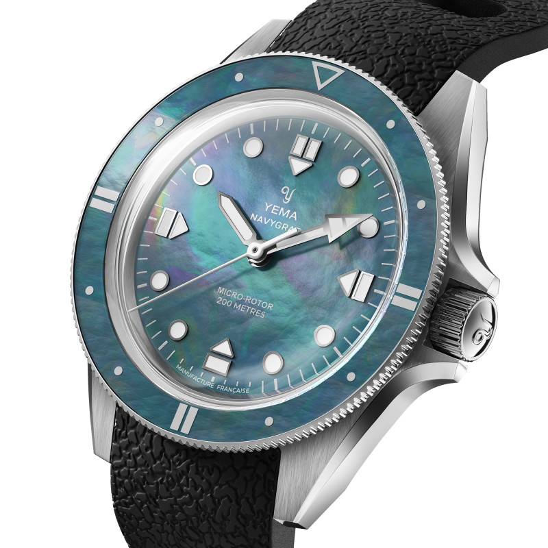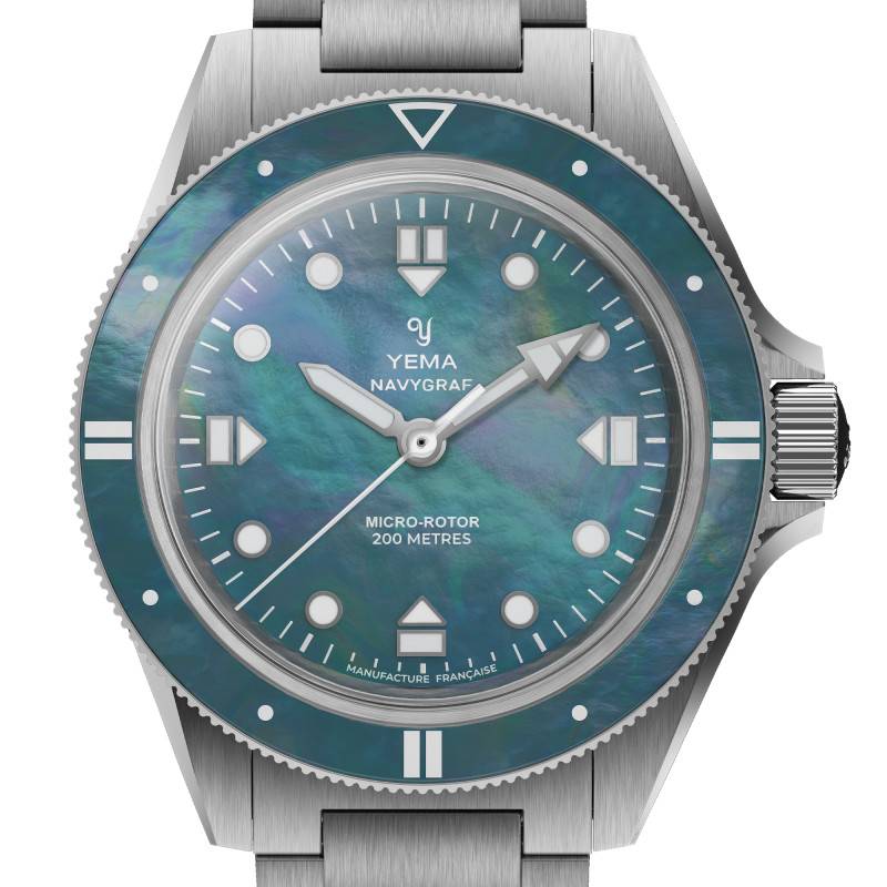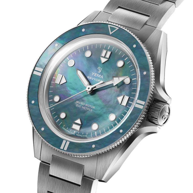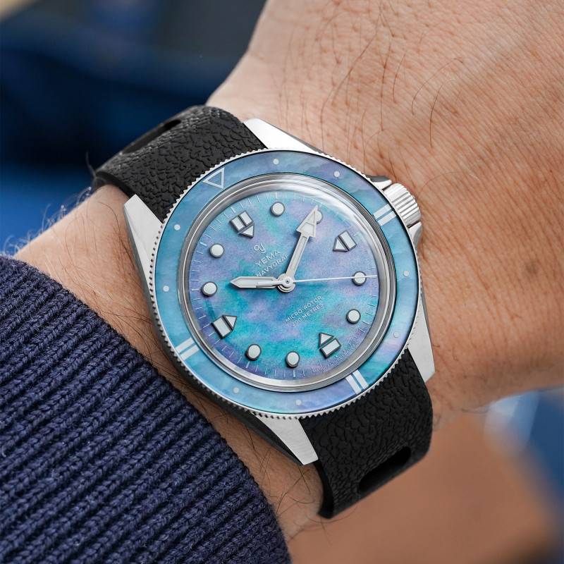 Le cadran de la Yema Navygraf Pearl est une véritable symphonie de couleurs et de textures. Fabriqué à partir de nacre naturelle, ce cadran unique scintille d'une irisation délicate, révélant une gamme de teintes changeantes allant de l'argenté au violet, en passant par le bleu turquoise. Chaque cadran est exclusif, rendant chaque montre aussi unique que chaque instant de la vie qu'elle chronomètre. Les aiguilles et index luminescents, traités avec un SuperLuminova BG W9, assurent que la lisibilité reste optimale même dans l'obscurité la plus totale. Le cadran est également agrémenté d'un chemin de fer des minutes, ajoutant une touche supplémentaire de précision et d'organisation visuelle. L'affichage analogique (aiguilles) présente les heures, minutes et secondes avec une clarté impeccable, solidifiant le rôle fonctionnel du cadran tout en accentuant son esthétique distincte.