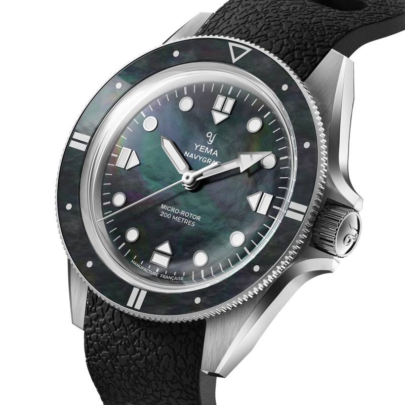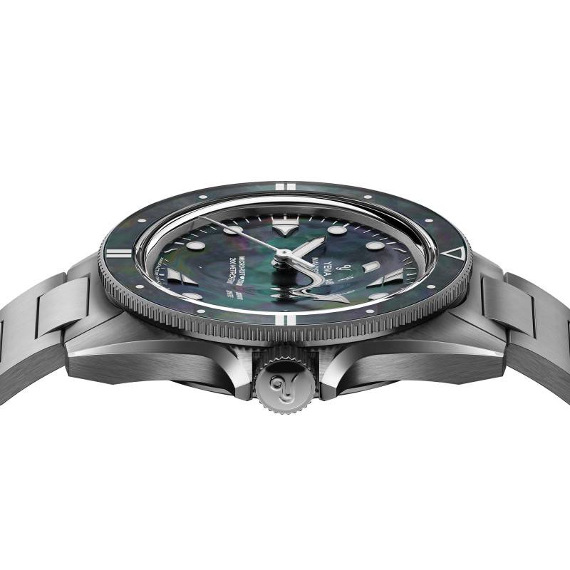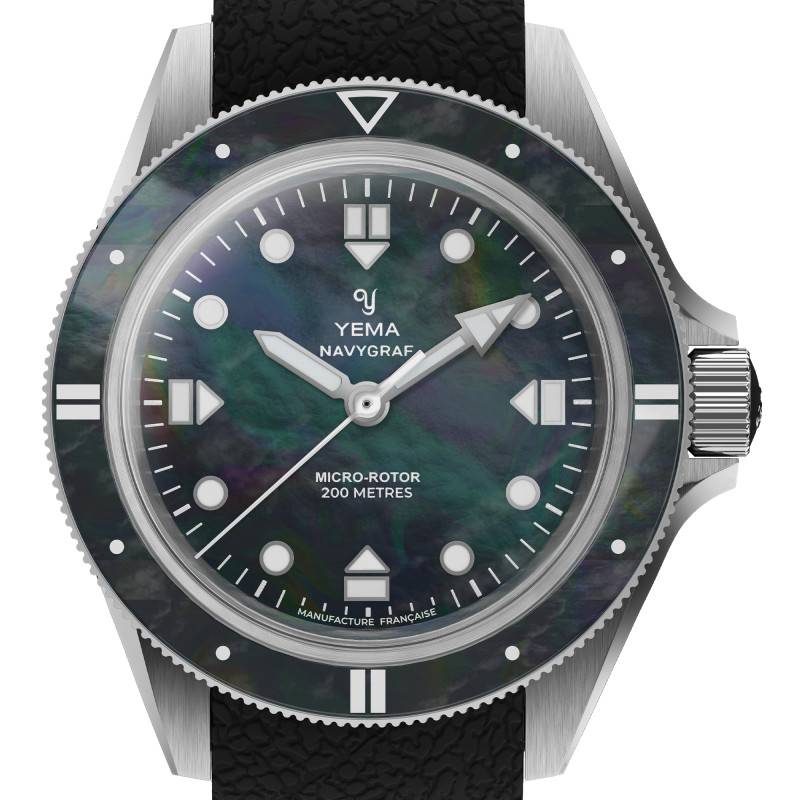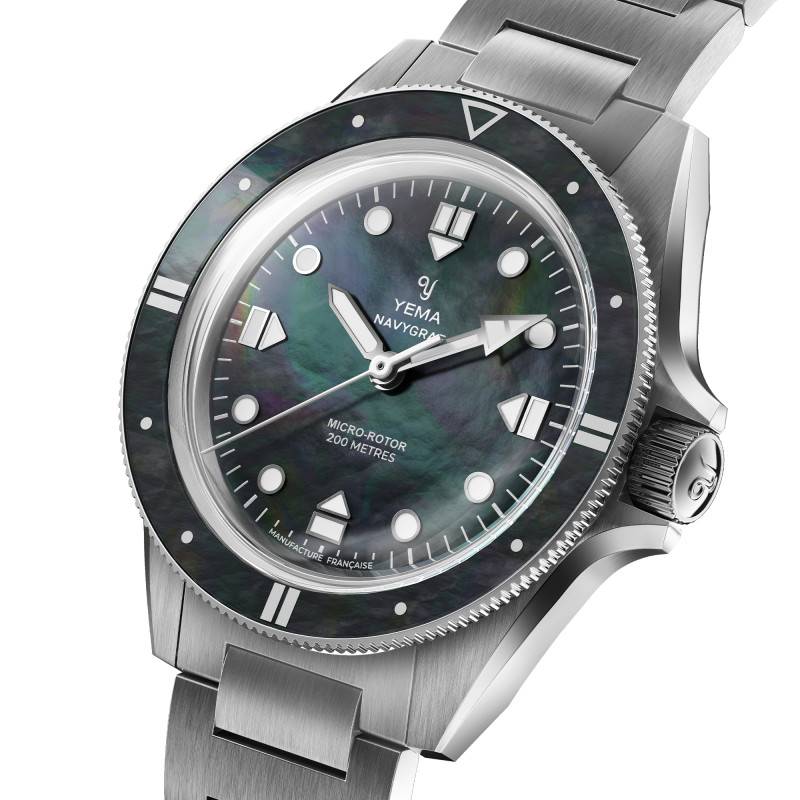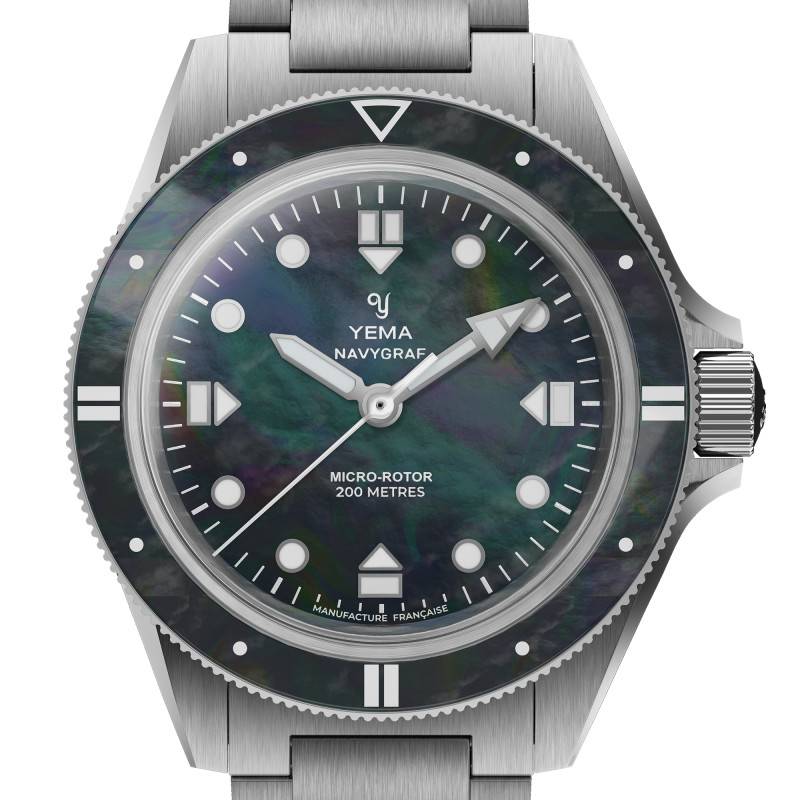 Le cadran de cette Yema Navygraf Pearl se distingue par sa finition nacrée qui lui confère une dimension unique. Il est fabriqué à partir de nacre naturelle, offrant une irisation délicate et changeante, chaque angle révélant des reflets argentés, violets et bleu turquoise, rendant chaque garde-temps unique. Les aiguilles et index sont pourvus d'un traitement luminescent à partir de SuperLuminova BG W9, garantissant une lisibilité exceptionnelle même dans l'obscurité.