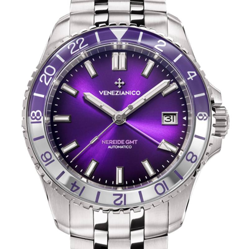 Le cadran de cette montre est une véritable œuvre d'art horlogère, arborant une magnifique teinte violette avec des finitions soleillées qui captent la lumière, conférant au cadran une profondeur et un éclat inégalés. Les chiffres arabes se détachent clairement sur le cadran, tandis que les aiguilles sont également conçues pour la visibilité et sont enduites de SuperLuminova BG W9 pour une visibilité maximale même dans l'obscurité. Cette montre intègre un dispositif GMT permettant d'afficher simultanément une deuxième heure, une fonction essentielle pour les voyageurs. Un chemin de fer précis longe le pourtour du cadran, ajoutant une touche classique à l'ensemble. À cela s'ajoute un guichet date positionné de manière subtile, offrant praticité et élégance sans encombrer l'esthétique générale du cadran.