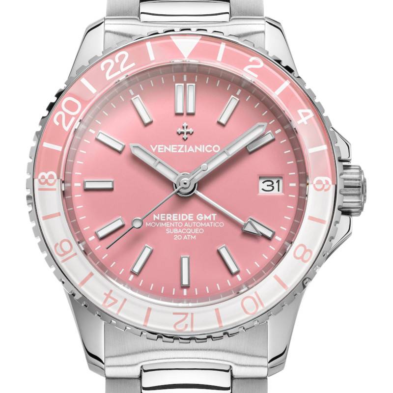 Les créations de la marque italienne Venezianico séduisent par leur robustesse et leur charme exquis. Fondée, en 2017, elle vise à mettre à la disposition des hommes et des femmes, des modèles prêts à sublimer leur allure en toute occasion. Alliant élégance et esprit sportif, ses garde-temps orneront votre poignet avec grâce tout en étant serviable en tout temps. Sa prestigieuse collection Nereide GMT vous présente cette sublime montre 3521506C. Elle se compose d'un boîtier rond dont la réalisation en acier inoxydable 316L confère à l'ensemble une résistance imparable face à la corrosion. Étant poli et brossé, ce boîtier argenté dispose d'un diamètre de 39 mm, d'une épaisseur de 13,30 mm pour une longueur corne à corne de 45,50 mm. Elle se pare également d'une lunette mise en avant par un cristal BK7 de finition miroir. Charmante et reflétant les couleurs des guimauves avec une couleur blanche pour les heures de la journée et rose pour celles de la nuit, elle vous communiquera les heures GMT. Grâce à la couronne crantée à 3 heures, il vous sera très facile de manipuler les éléments centraux. Étant vissée, cette dernière fusionne l'esthétique à la praticité. Pour une lisibilité plus optimale dans les endroits trop éclairés, le cadran de cette montre est couvert par un verre saphir plat de traitement antireflet. Par ailleurs, veuillez noter que ce modèle est muni d'un fond de boîte maintenu par des vis affichant la gravure des 24 fuseaux horaires qui confère à ce garde-temps une large étanchéité de 20 ATM. Vous serez prêt en toute occasion pour défier les secrets des profondeurs marines.