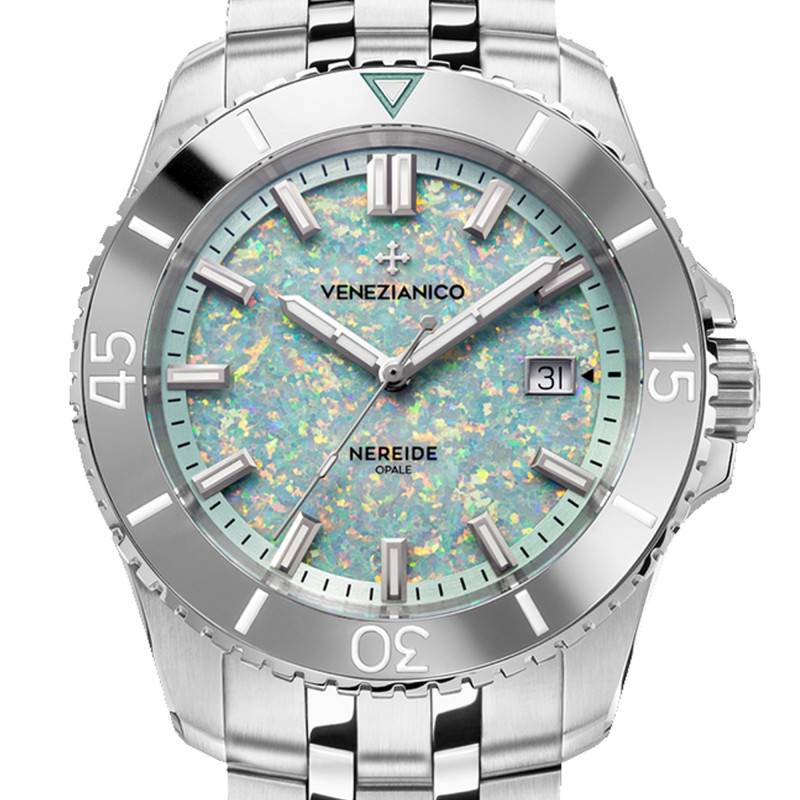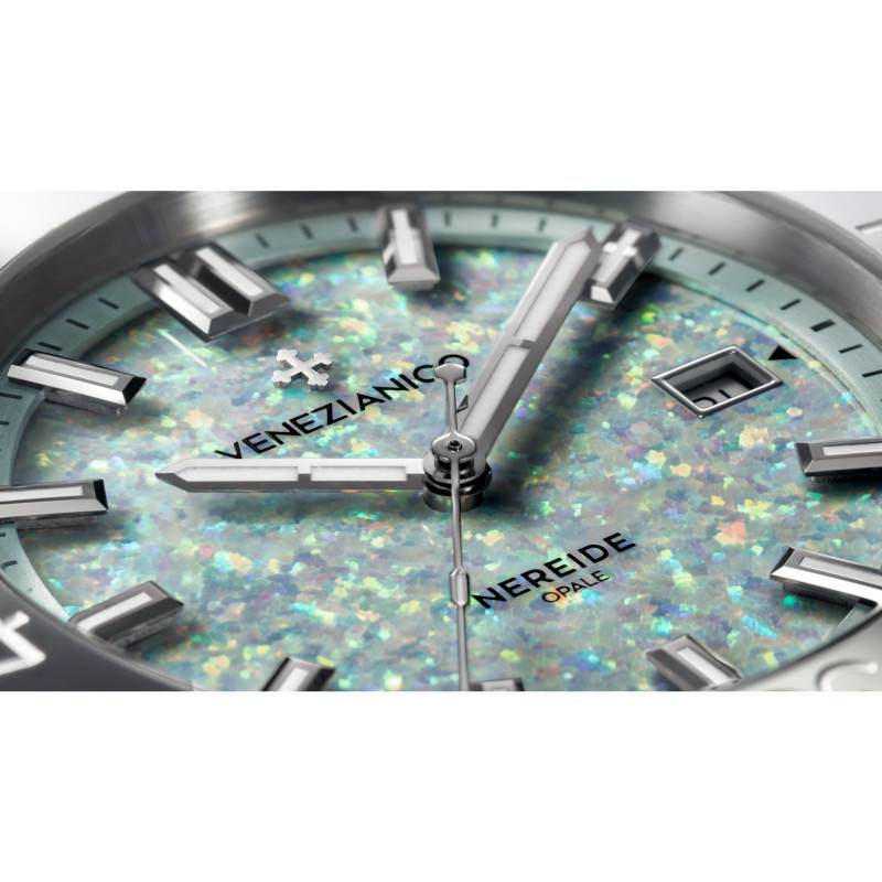 La montre Venezianico Nereide Opale est une fusion parfaite entre l'élégance italienne et le savoir-faire horloger suisse. Édition limitée à 500 pièces, elle se distingue par un boîtier rond en acier inoxydable 316L qui incarne la robustesse et l'élégance. Mesurant 42 mm de diamètre et avec une épaisseur de 12,5 mm, ce modèle est conçu pour être aussi fonctionnel qu'esthétique. La finition mate (brossée/satinée) et polie/brillante de l'acier accentue le contraste et offre une allure contemporaine. L'ensemble est complété par une lunette rotative en tungstène, à la fois résistante et raffinée. Le fond de la boîte est transparent et maintenu par des vis, offrant une vue dégagée sur le mécanisme interne riche en détails.