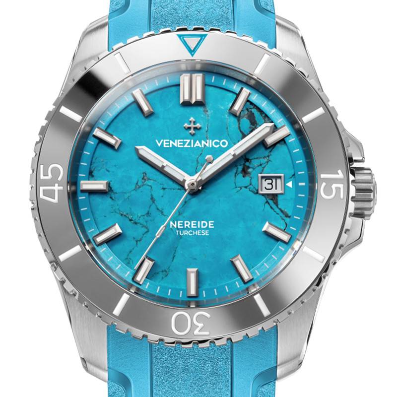 Le cadran de la Nereide Turchese est un véritable hommage à la tradition et à l'art artisanal. Composé de pierre turquoise naturelle, il évoque non seulement la beauté saisissante mais aussi l'histoire culturelle des échanges entre la Perse et Venise. Cette pierre précieuse est vénérée pour sa teinte bleue vibrante, qui a traversé les siècles comme symbole de protection et de prestige. Les aiguilles et les index luminescents, traités au SuperLuminova BG W9, offrent une excellente lisibilité même dans des conditions de faible éclairage, faisant ressortir chaque détail du cadran avec une clarté exceptionnelle. Un chemin de fer des minutes vient délicatement encadrer ce cadran, assurant une lecture précise du temps en toute circonstance. Un guichet date, positionné idéalement à 3 heures, complète le tout pour apporter une fonctionnalité discrète mais essentielle à ce garde-temps d'exception.
