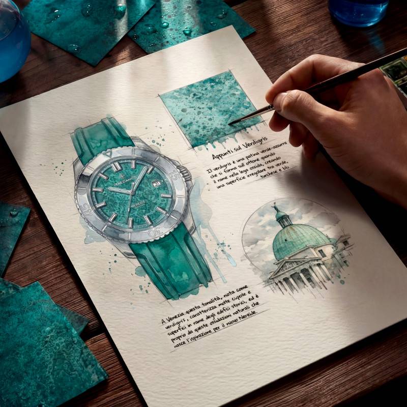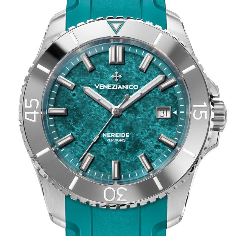 Le cadran constitue l'élément le plus distinctif de ce modèle. L'idée de sa conception est née de l'observation de la transformation progressive des métaux de Venise. Sous l'effet de l'air salin et de l'humidité de la lagune, le cuivre et le laiton développent au fil des années une patine vert-de-gris caractéristique, révélant des nuances de vert et de turquoise. Réalisé à partir d'une base en laiton, le cadran de la Nereide subit un procédé artisanal d'oxydation et de flambage contrôlés, qui lui confère cette esthétique singulière. Chaque pièce présente ainsi des variations naturelles de teintes et de textures, offrant des reflets changeants selon la lumière et rendant chaque montre unique. Protégé par un verre saphir plat traité antireflets, il garantit une lisibilité optimale grâce au chemin de fer des minutes, aux index appliqués et aux aiguilles luminescentes traitées au SuperLuminova BG W9. Un guichet date discret vient renforcer l'aspect fonctionnel du modèle.