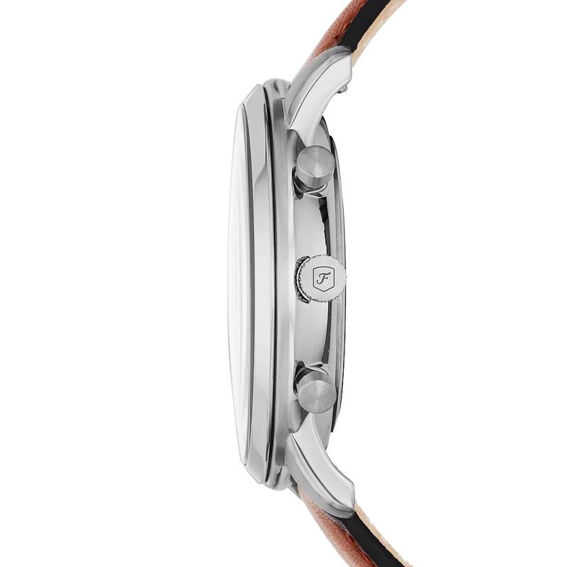 Finesse et élégance sont au rendez-vous dans ce modèle dévoilé par la célèbre marque Fossil. Cette montre chronographe se compose d'un boîtier robuste en acier inoxydable et de couleur argentée. Il dispose d'une couronne remontoir logée à 3 heures afin de remettre à l'heure les trois aiguilles. Celle-ci s'entoure de deux boutons-poussoirs servant à activer les trois compteurs. Son boîtier affiche des dimensions plutôt masculines avec un diamètre de 44 millimètres pour une épaisseur avoisinant les 11 millimètres. Enfin, le fond est emboîté et assure une étanchéité de 5 atmosphères.