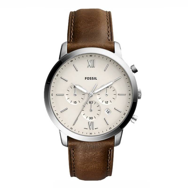 La gente masculine appréciera ce modèle au cadran de couleur crème. Dissimulés en son coeur, chaque détail est pensé pour vous satisfaire. De forme traditionnelle ronde, il abrite trois compteurs ton-sur-ton qui se laissent peu entrevoir, pour un design épuré. A trois, six et neuf heures, ils indiquent respectivement un compteur vingt-quatre heures, soixante secondes et trente minutes. Notez que l'aiguille des heures et celle des secondes sont luminescentes grâce à leur revêtement blanc. La fine et longue trotteuse, de couleur argentée se déplace sur le pourtour du cadran. Les index, eux aussi luminescents, sont représentés par des bâtons ainsi que par des chiffres romains à midi et à six heures. Un chemin de fer des minutes prend discrètement place sur le réhaut, accompagné de chiffres arabes numérotés de 05 à 60. De plus, un guichet date est présent entre quatre et cinq heures. Fossil signe de son nom cette montre, à midi.