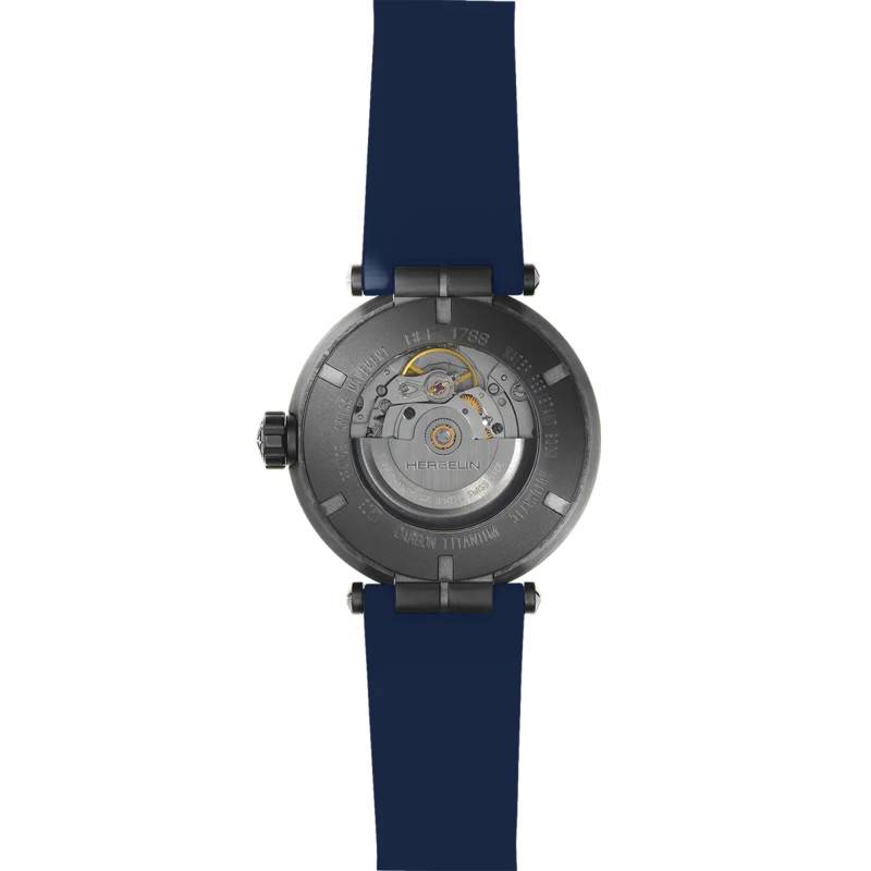 La maison tricolore Herbelin vous propose depuis les années 40 son savoir-faire horloger. Aujourd'hui, la marque vous propose de découvrir sa plus récente création, la montre Newport Carbon Titanium 1788CTN15CB automatique. Celle-ci se présente à vous sous un magnifique boîtier de forme ronde, très versatile. D'un diamètre de 43mm et d'une épaisseur de 12.45 mm, elle se faufilera facilement sur n'importe quel poignet masculin. Particularité notable de ce dernier, sachez qu'il a été entièrement construit en carbone forgé. Le carbone forgé est un matériau exclusif au procédé technique d'usinage unique. En effet, à l'instar d'un carbone classique venant d'un tissage, il est conçu au moyen de morceaux de carbone mélangés à de la résine. Cela rend cette matière ultrarésistante aux chocs. Sa lunette présente l'aspect de ce matériau et lui confère un cachet indéniable. De plus, 5 vis à 6 pans décorent le tout, pour un rappel nautique des plus subtils. Vous y trouverez également le nom de la collection, "Newport", au niveau de sa base. La couronne de remontoir, située à 3h, est vissée. Sa forme crantée permet une excellente prise en main. Son rôle est de régler l'heure, ainsi que la date et le jour. Le fond de boîte en titane DLC s'avère être vissé et vous offre la possibilité, grâce à son verre transparent, d'admirer le calibre donnant vie à ce garde-temps.