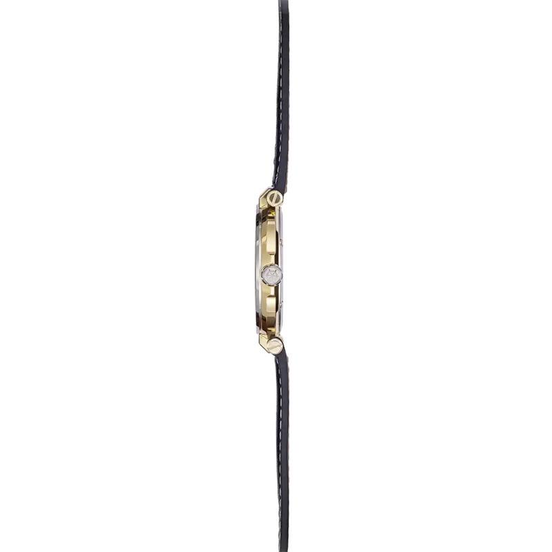 Le bracelet de cette montre est un complément parfait à son boîtier sophistiqué. Fabriqué en cuir de bovin d'un bleu profond, il allie souplesse et résistance, assurant un confort durable tout en rehaussant l'élégance générale du garde-temps. Les surpiqûres blanches contrastent délicatement avec le cuir, ajoutant une touche de raffinement supplémentaire. Ce bracelet se ferme grâce à une boucle ardillon, offrant un ajustement sécurisé et facile.