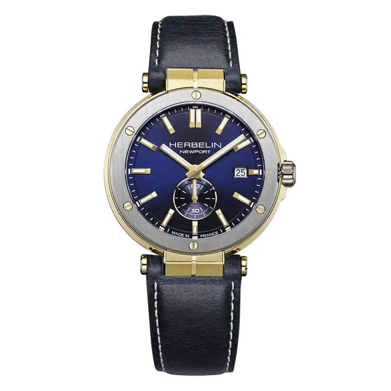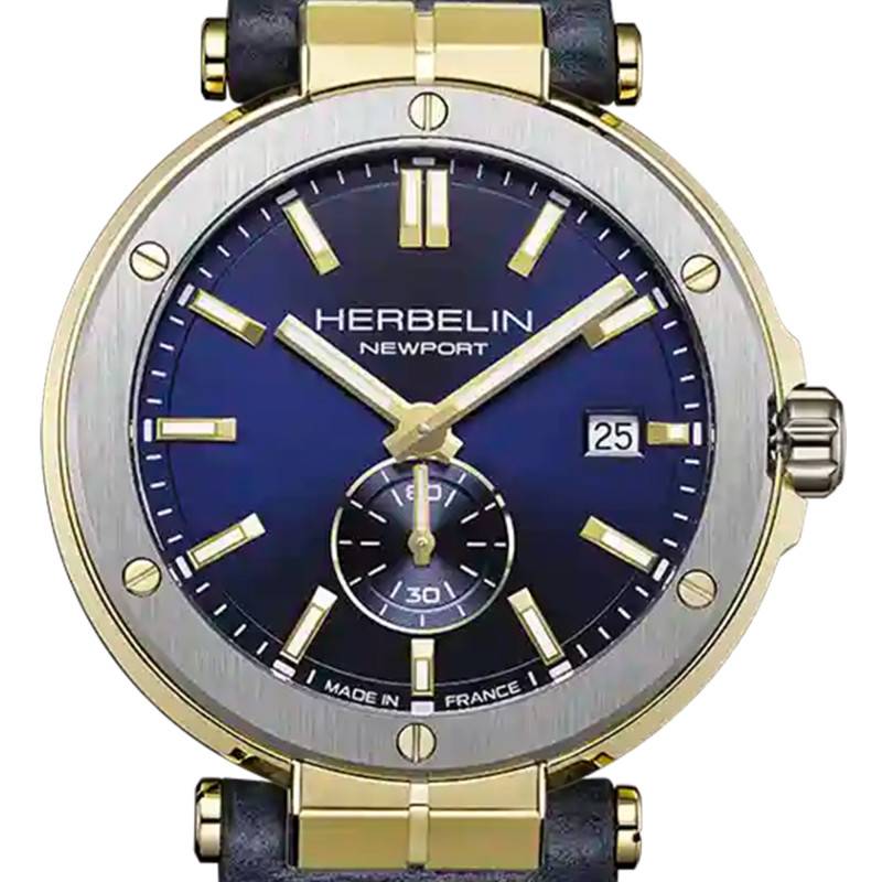 La montre Michel Herbelin Newport Elegance présente un boîtier rond en acier inoxydable 316L, une matière reconnue pour sa résistance à la corrosion et son éclat durable. Ce boîtier est sublimé par une finition mate (brossée/satinée), ajoutant une dimension de subtilité et de qualité haut de gamme. La teinte raffinée du PVD jaune confère une allure moderne à l'ensemble tout en créant un contraste attrayant avec le bleu du cadran et du bracelet. La montre est dotée d'un verre saphir plat, réputé pour sa résistance aux rayures et complété par un traitement antireflets pour garantir une lisibilité optimale en toutes conditions. Le poids de 61 grammes du boîtier assure un port confortable sans compromettre la présence au poignet.