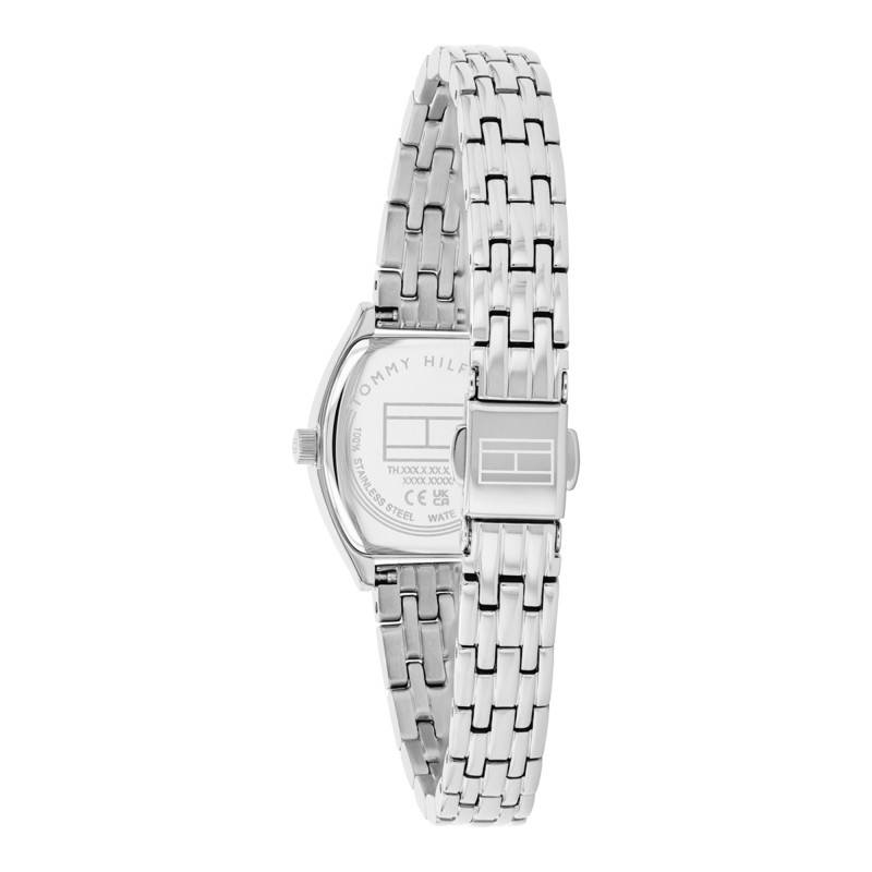 Cette montre se distingue par son design à la fois classique et contemporain, signé Tommy Hilfiger. Sa boîte en forme de tonneau donne à ce modèle une allure chic et originale. Conçue en acier inoxydable, elle assure robustesse et longévité tout en offrant une finition brillante qui capte la lumière sous différents angles. Avec un diamètre de 22 mm, elle s'adapte parfaitement aux poignets féminins en quête de discrétion et d'élégance. Le verre protégeant le cadran est un verre minéral, connu pour sa résistance aux rayures et sa clarté. Le fond du boîtier est emboîté, une caractéristique classique qui contribue à l'étanchéité de la montre, évaluée à 3 ATM. La couronne est située de manière traditionnelle sur le côté droit, permettant un ajustement facile de l'heure.