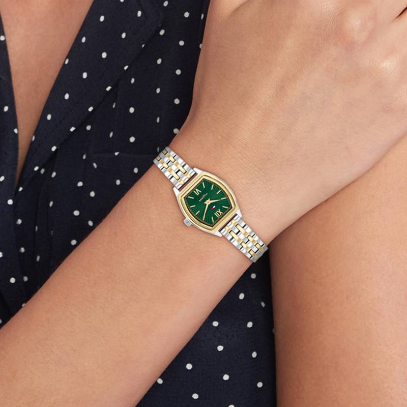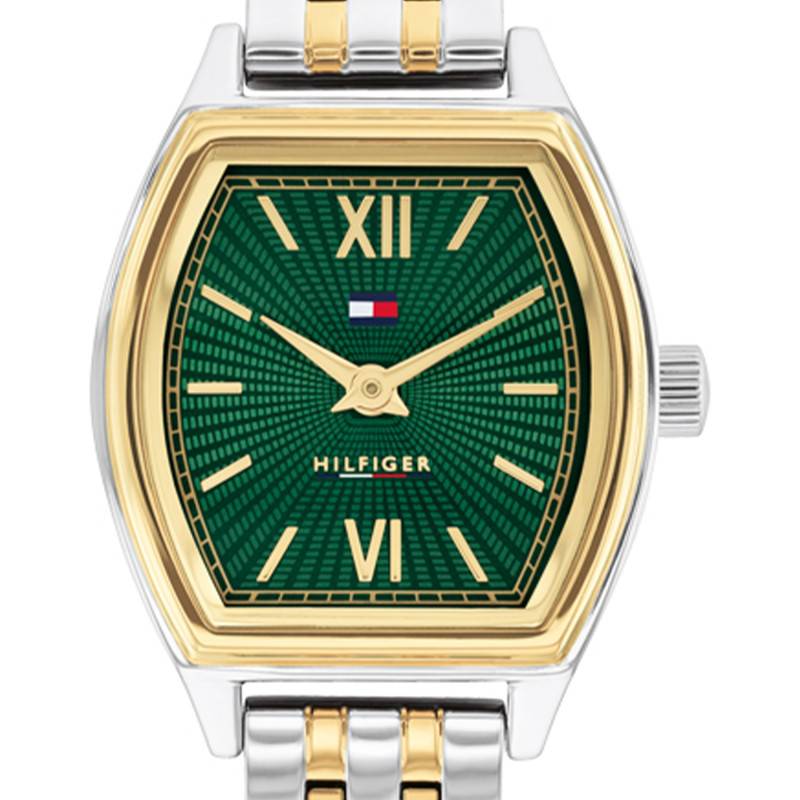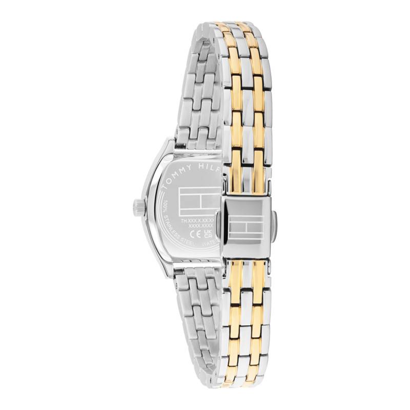 Cette montre Tommy Hilfiger Norah, élégamment conçue pour les femmes, combine raffinement et style contemporain. Avec son boîtier en forme de tonneau, elle se distingue par une allure chic et féminine qui s'accorde parfaitement avec son design bicolore en acier inoxydable. Le contraste entre les teintes blanc et jaune apporte une touche de modernité, combinant robustesse et légèreté avec un poids de seulement 42g. Son épaisseur de 7mm et son petit diamètre de 22mm font de cette montre un accessoire délicat au poignet. Son fond de boîte emboité garantit une finition lisse et homogène, tout en assurant une bonne résistance à l'eau avec une étanchéité certifiée à 3 ATM.