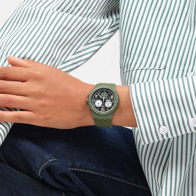 Révolutionnaire, la maison horlogère suisse Swatch ne cesse de confectionner des modèles alliant finesse et technicité dans le but de vous accompagner en toute légèreté au quotidien. Elle vous propose des garde-temps tous aussi équipés les uns que les autres afin de vous garantir une importante fiabilité au cours de leur utilisation. Elle vous invite à découvrir la montre Nothing Basic About Green SUSG406 destinée à la gent masculine. Elle se pare d'un boîtier rond en plastique affichant 42 mm de diamètre. De couleur verte, ce dernier dispose d'une lunette de couleur vert foncé comportant une échelle tachymétrique affichant des graduations blanches. Elle entoure un verre bombé qui surplombe entièrement le cadran. Quant à ce dernier, il dispose des éléments centraux qui seront manipulés par la couronne kaki et les deux boutons-poussoir qui l'accompagnent. Idéale pour les activités sportives, cette montre dispose d'un fond de boîte qui lui assure une étanchéité de 3 ATM.