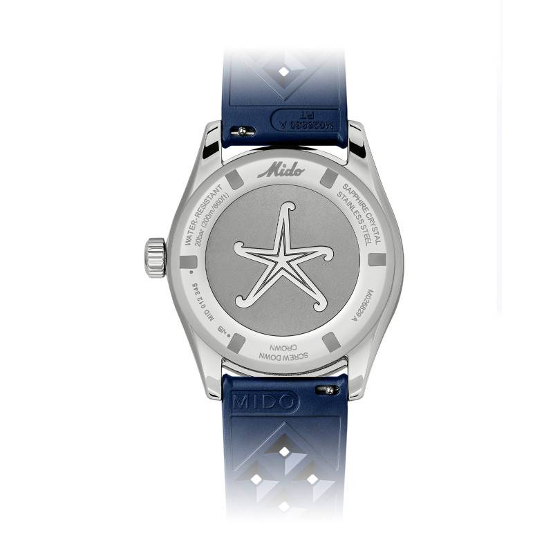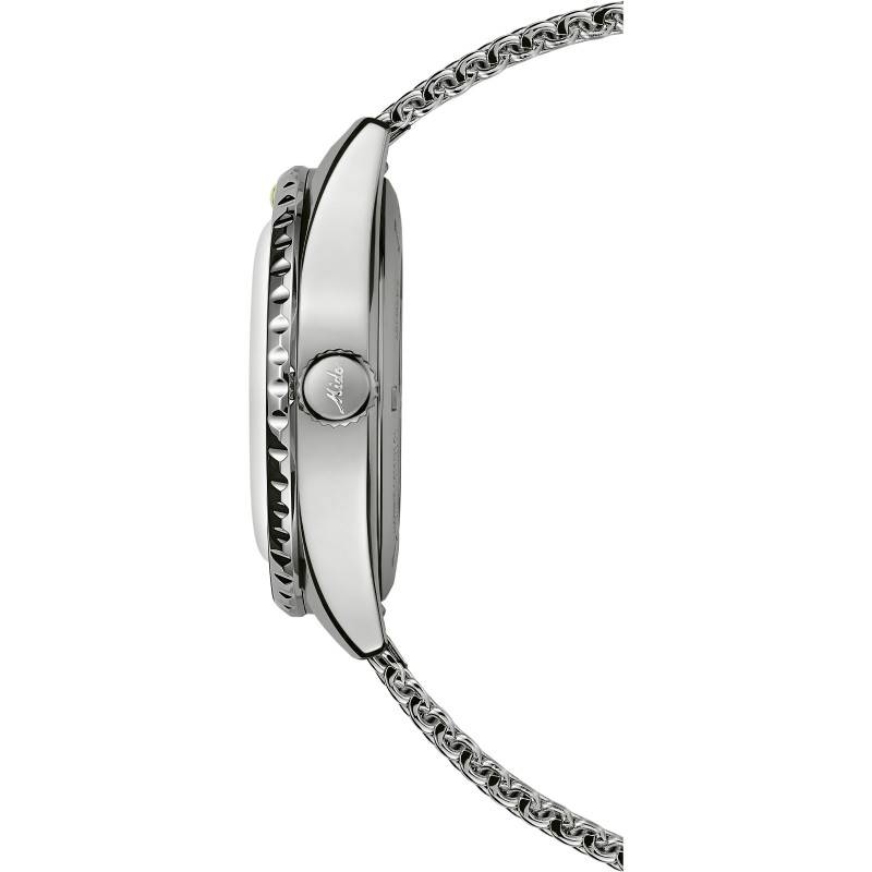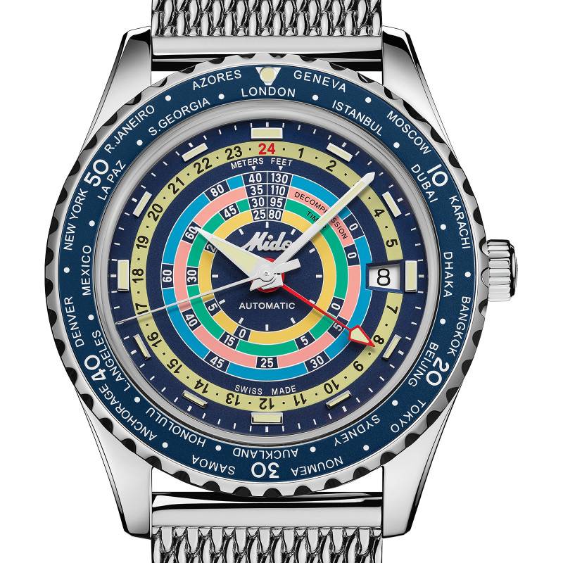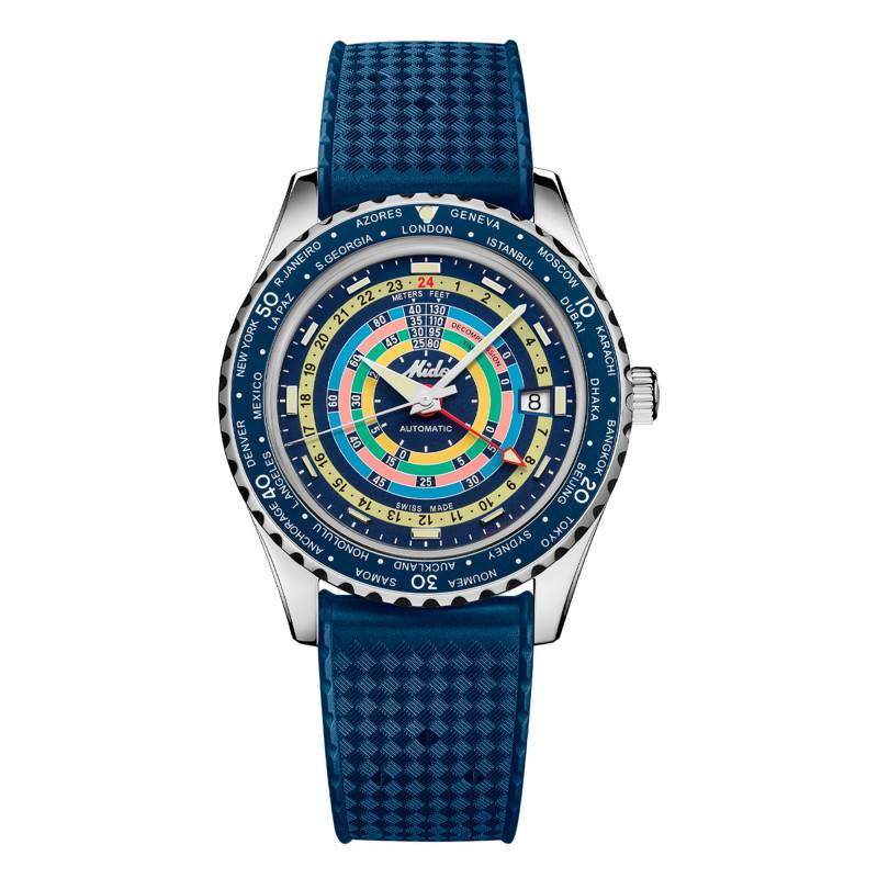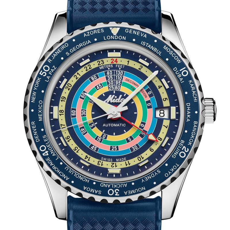 Mido est une marque suisse fondée en 1918 connue pour être une pionnière dans l'horlogerie de précision. Elle propose à travers ses gammes des garde-temps sobres, élégants, résistants et fonctionnels. Ocean Star est une collection phare dédiée aux montres de plongée robustes et fiables et qui ont tous les éléments pour convaincre les passionnés d'aventures sous-marines. Le modèle Decompression World Timer se présente avec un boîtier en acier inoxydable de 40,5 mm de diamètre et 13,40 mm d'épaisseur. De forme ronde, il a un poids de 220 grammes et il est entièrement poli, donnant à la montre une brillance des plus élégantes. Ce dernier est surmonté par une lunette tournante bidirectionnelle avec un repère lumineux et une couleur bleue pour un look irrésistible et rafraîchissant. Celle-ci est marquée par le nom des villes représentant les 24 fuseaux horaires afin d'assurer la fonction GMT. Comme protection, un résistant verre saphir glassbox recouvre le cadran afin d'empêcher tous chocs de lui nuire. La couronne placée à 3 heures est vissée et permet le réglage des heures, des minutes et de la date. Également vissé, le fond de boîte est marqué par le logo Ocean Star représenté par une étoile de mer. Celui-ci renforce la durabilité de ce garde-temps tout en permettant une étanchéité de 20 ATM.