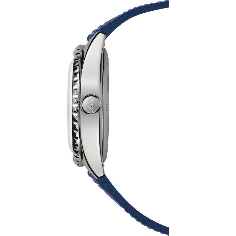 Ce garde-temps est muni d'un bracelet en caoutchouc de 21 mm de largeur. Il a une superbe couleur bleue assortie à celle de la lunette et comporte un système d'éperon qui permet des changements de sangle rapides et faciles. Notez qu'il se termine par une boucle ardillon en acier inoxydable.