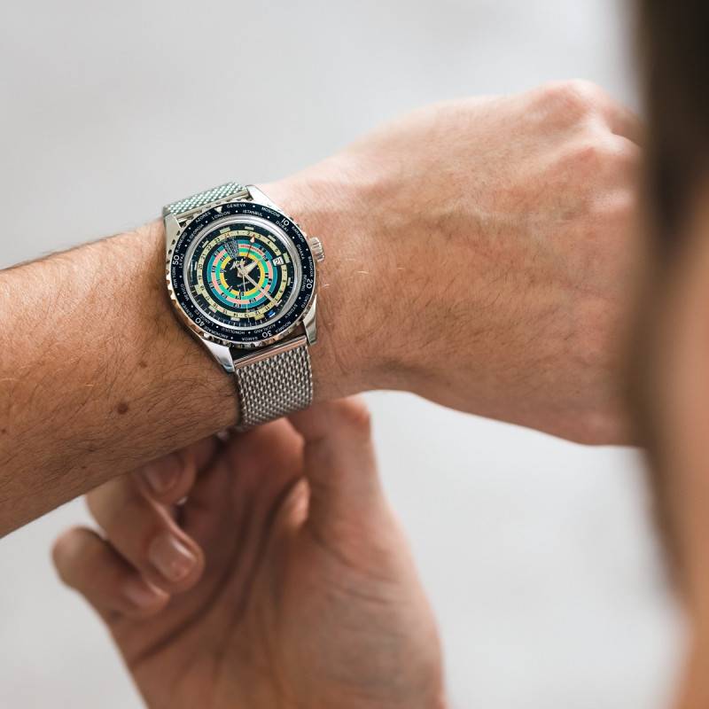 Le cadran de ce modèle ne vous laisse pas indifférents grâce à son ensemble de couleurs et ses formes audacieuses. Idéal pour la plongée, il affiche différentes informations relatives aux paliers de décompression. De fond bleu, vous trouverez sur sa circonférence un chemin de fer marquant les minutes. Ce dernier entoure des index rectangulaires luminescents majorés chaque 3 heures marquants les heures. Ils sont accompagnés dans leur tâche par un cercle de fond jaune marqué par des chiffres arabes de 0 à 24. Au centre, 4 aiguilles luminescentes se diffèrent l'une de l'autre par leur forme. Celle des heures, plus volumineuse que les autres, est de type dauphine. Quant à celle des minutes, elle est de forme épée tandis que la fine trotteuse désigne les secondes. La 4ᵉ arborant une pointe en flèche de couleur rouge pointe l'heure GMT. En dessous de 12 heures, vous trouverez des chiffres vous indiquant la profondeur maximale exprimée en pieds à droite et en mètres à gauche. L'échelle de paliers de décompression est formée de plusieurs bandes multicolores représentant chacune une profondeur de plongée. Le petit cadran central comporte des petits index, le nom de la marque et le type de mouvement. Pour finir, la complication date est placée dans un guichet à 3 heures.