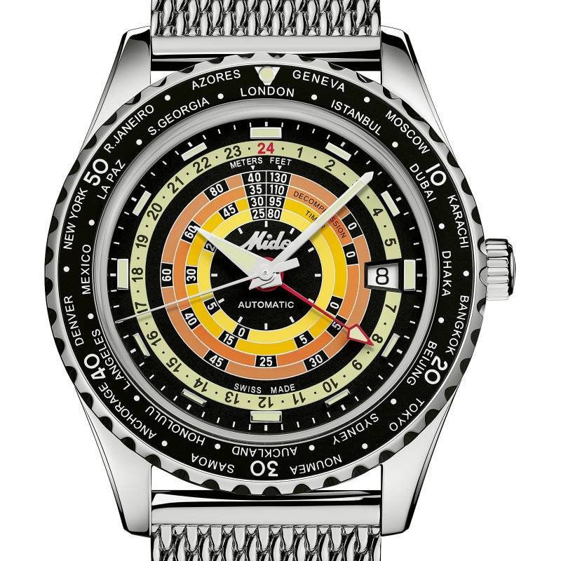 Mido confectionne des montres fonctionnelles et robustes à remontage automatique. Cette marque propose des collections entièrement dédiées aux modèles de plongée munis de boîtiers monocoques et d'un système Aquadura. Elle ne cessera jamais de se surpasser pour atteindre la perfection en vous proposant des prototypes qui assurent une excellente étanchéité grâce au joint de couronne en liège. Dans la collection Ocean Star, se trouve cette Captain Decompression de référence M0268291705100. Elle se pare d'un boîtier de forme ronde fabriqué en acier inoxydable. Sa brillance est accentuée grâce à sa finition polie qui confère à cette horloge un éclat bien défini. Ce dernier arbore un poids de 220 grammes avec un diamètre de 40,50 millimètres et une épaisseur de 13,40 millimètres. Vous noterez que ces dimensions conviendront parfaitement aux poignets masculins. Une lunette cannelée tournante et bidirectionnelle surplombe cette montre. Munie d'un marqueur luminescent, elle a pour particularité d'être marquée par le nom des 24 villes représentant les différents fuseaux horaires. Son cadran est recouvert par un verre saphir bombé très résistant qui le protégera des chocs extérieurs et des rayures du quotidien. À 3 heures, vous remarquerez la présence d'une couronne vissée sur laquelle est gravé le nom de la marque. Elle vous offrira la possibilité de régler les multiples fonctions de ce garde-temps. Son étanchéité de 20 ATM est assurée par le fond de boîte vissé sur lequel sont inscrites quelques caractéristiques.