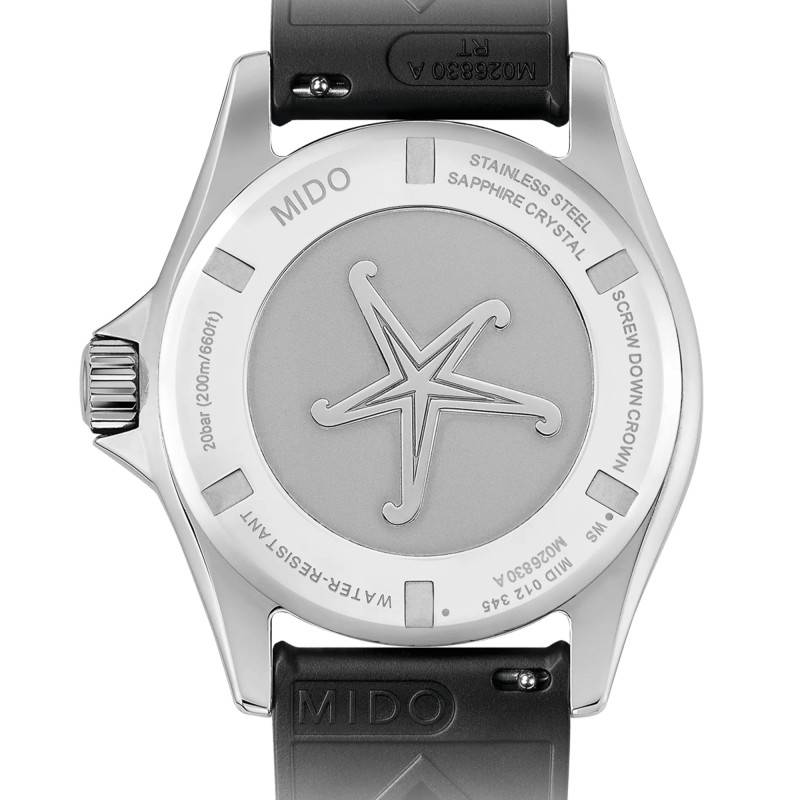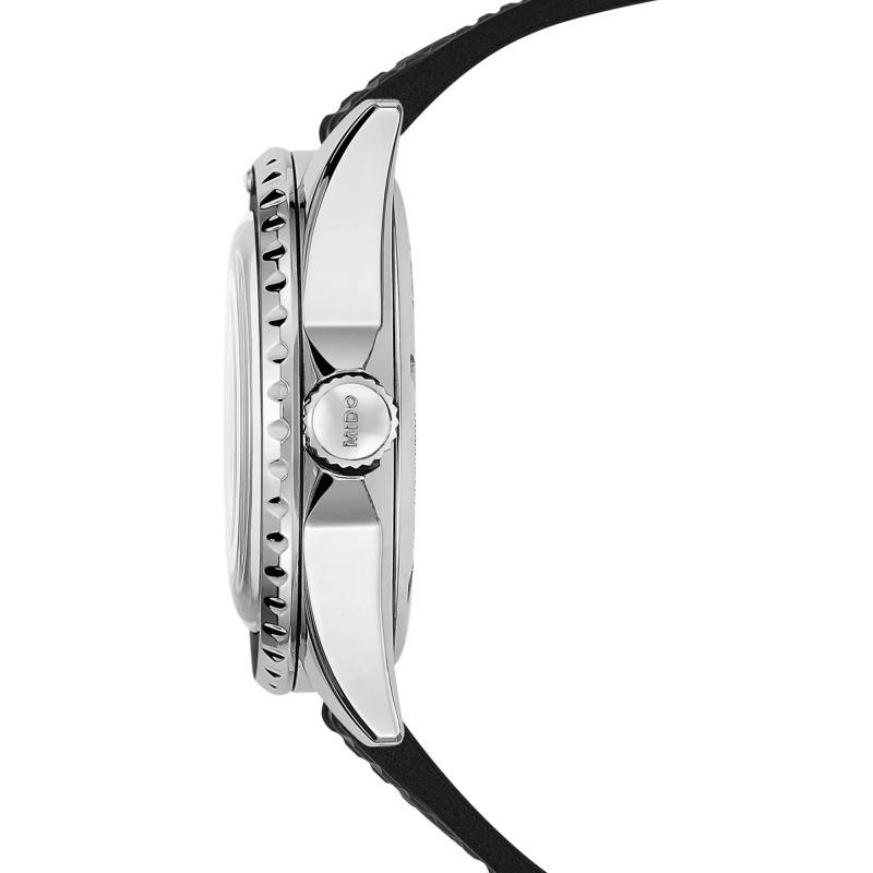 Mido vous dévoile sa nouvelle montre plongeuse élégante et intemporelle. Son diamètre de 40,5 mm et ses 13.43 mm hauteur arboreront parfaitement les poignets masculins. Ses 100 grammes vous accompagneront en toute légèreté. Son boîtier en acier inoxydable de forme ronde est entièrement poli, donnant une élégance supplémentaire à votre garde-temps. Son verre en saphir viendra protéger votre cadran des éléments tel que l'eau ou la poussière, qui pourraient altérer votre mécanisme. Plus qu'une simple montre, ce bijou sera capable de vous accompagner dans vos activités aquatiques grâce à sa lunette rotative en aluminium. Cette dernière est crantée sur le bord et se pare de noire pour sublimer votre montre. Des repères en chiffres arabes sont présents toutes les 10 minutes. A 12 h, un point de Super-Luminova® vous permettra de vous repérer en milieu obscur. Le fond de boîte vissé ainsi que la couronne remontoir crantée et vissée placée à 3 h contribueront à assurer l'étanchéité de 20 ATM sur votre pièce horlogère.