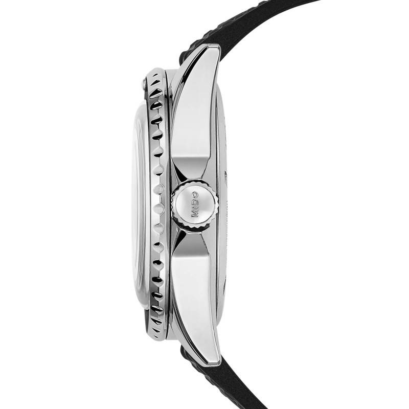Mido vous fait profiter de sa montre de plongée. Son boîtier de 40,5 mm et ses 13.43 mm de hauteur donneront élégance et intemporalité à votre garde-temps pesant seulement 100 grammes. Votre bijou dispose d'un boîtier en acier inoxydable rond à la finition polie. Votre pièce horlogère vient être sublimée par une lunette rotative en aluminium crantée. Sa couleur noire laisse ressortir des repères en chiffres arabes de couleurs blanches espacés de 10 minutes chacun. Un repère luminescent à 12 h a été disposé grâce à l'utilisation d'un point de Super-Luminova®. Un verre saphir vient surmonter votre boîtier afin de le protéger des altérations ou des rayures. Le fond de boîte vissé de votre pièce horlogère permettra d'assurer une étanchéité de 20 ATM à votre montre. La couronne remontoir nichée à 3 h, a la particularité d'être vissée et crantée, il faudra veiller a ne pas la manipuler lors de vos sorties aquatiques.