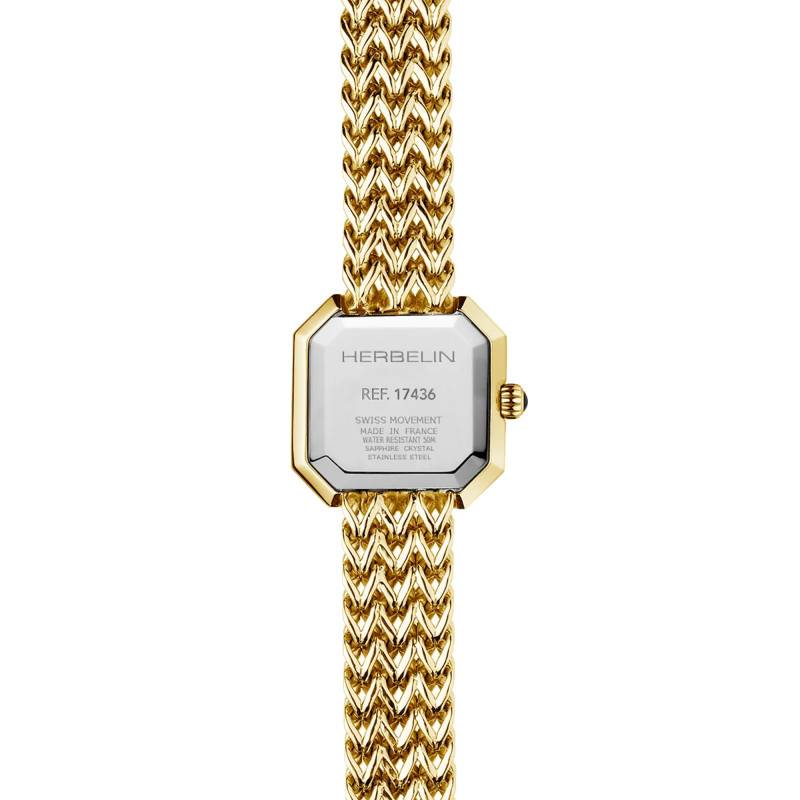 Depuis 1947, la marque horlogère Michel Herbelin ne cesse d'impressionner. En effet, la marque transmet des valeurs et un savoir-faire français uniques. Aujourd'hui, cette Maison présente son nouveau modèle 17436/BP49 issu de la collection Octogone. Ce garde-temps unique séduira les femmes en quête d'une montre intemporelle, élégante et discrète. Pourvu dans un boîtier en acier inoxydable 316L (revêtement par PVD or jaune), elle dispose des dimensions suivantes : 22.2mm d'épaisseur, 22.2mm de longueur et 5.8mm d'épaisseur, permettant d'habiller parfaitement les poignets féminins. Ainsi, sa forme octogonale vous propose sur le dessus un verre saphir qui viendra abriter les détails du cadran. Par ailleurs, cette montre dispose d'un bouton remontoir situé à 3 heures. Cette couronne vous permettra de contrôler les aiguilles centrales. Enfin, elle vous propose une étanchéité de 3 atmosphères.