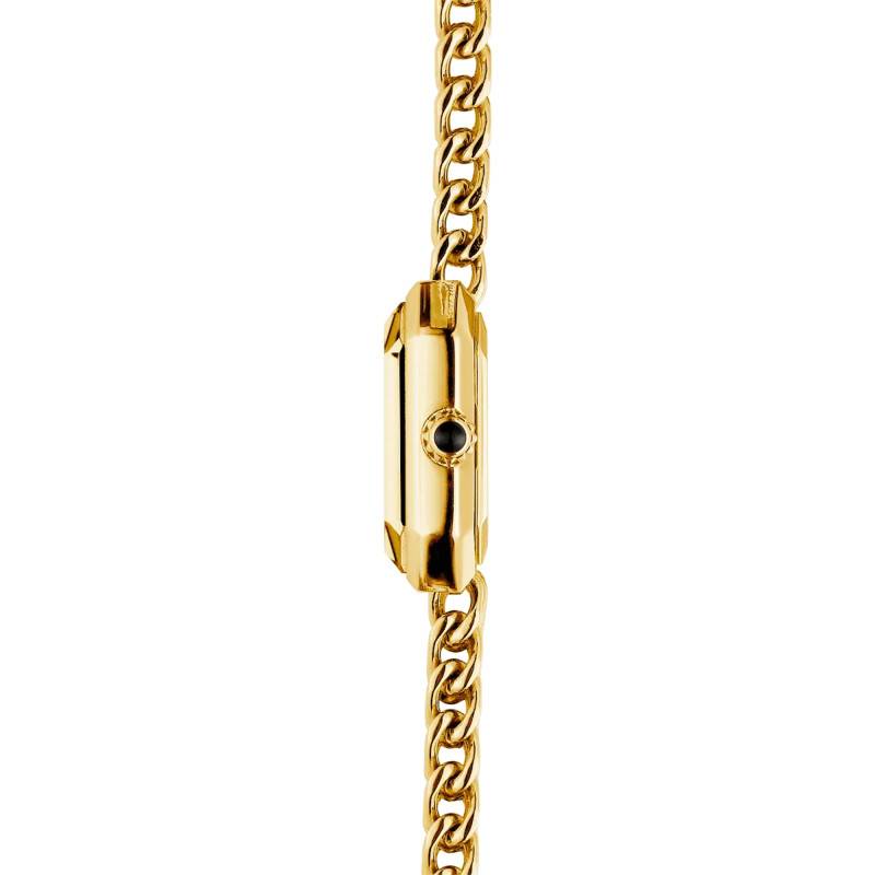 La maison vous propose un bracelet rigide qui accompagnera parfaitement ce modèle design. Fait d'acier inoxydable 316L et revêtu d'un traitement en PVD or jaune, ce bracelet conviendra parfaitement et habillera idéalement votre poignet. Notez que cette dernière se ferme avec une boucle déployante simple.
