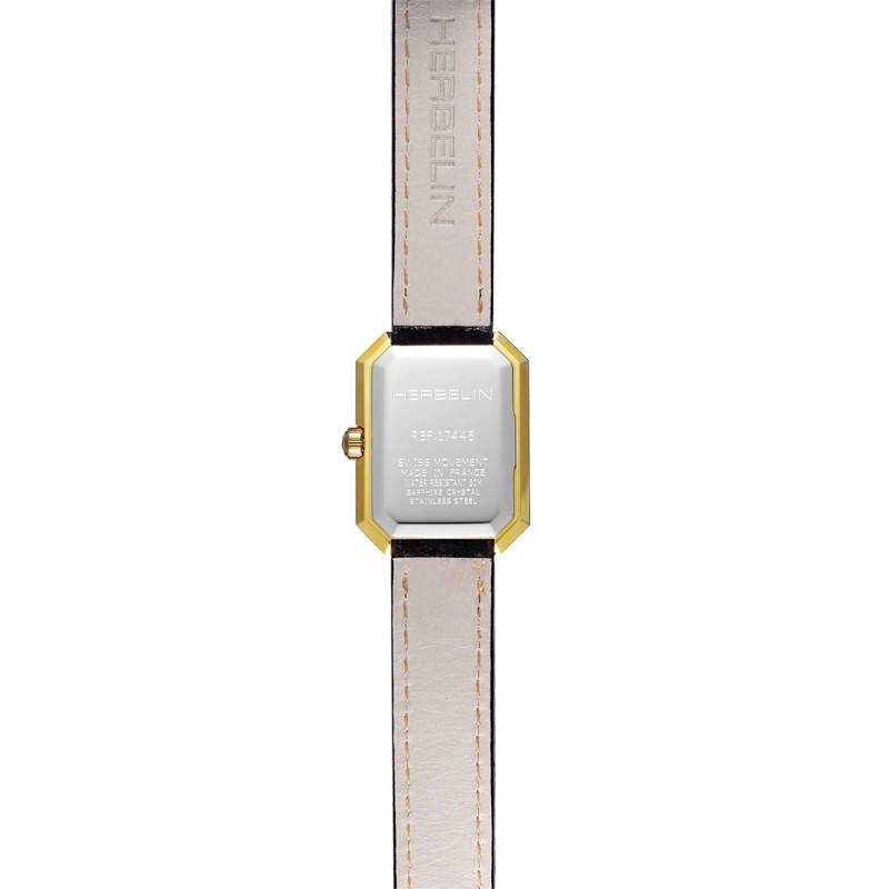 Depuis sa création en 1947, Herbelin partage sa passion horlogère à travers des garde-temps emblématiques au design élégant et raffiné. Toutes ses créations sont dessinées, assemblées à la main, contrôlées et réparées dans les ateliers francs-comtois de l'entreprise. Elle vous présente la montre Octogone 17446P49 qui se distingue par son style distingué. Elle est livrée avec un boîtier octogonal agréablement soigné et souligné par des lignes épurées et des bords biseautés. Celui-ci est conçu en acier inoxydable et traité au PVD gold ce qui lui confère une belle teinte dorée. Ce boîtier se démarque par ses petites dimensions parfaitement adaptées aux poignets féminins avec une largeur de 20,40 mm, une longueur de 26,40 mm et une épaisseur de 6,40 mm. Un verre saphir plat surplombe ce dernier pour protéger le cadran contre les rayures. Pour ce qui est de la couronne, elle est ondulée, siglée et placée à 3 heures pour un réglage facile des heures et des minutes. Enfin, au dos de la montre, se trouve un fond emboîté qui promet une étanchéité de 5 ATM.