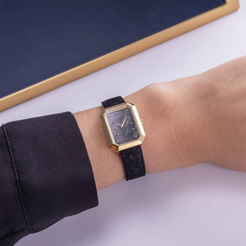 Très beau à regarder et à lire, le cadran de cette montre affiche une finesse et une beauté minimaliste. Sa base est réalisée à partir de nacre noire aux belles nuances en parfaite harmonie avec les index dorés. Sous forme de rivets pyramidaux, ceux-ci sont pointés par des aiguilles dauphines également de teinte dorée. Soigneusement facettées, ces dernières indiquent les heures et les minutes avec une grande précision. Le tout est rehaussé par la signature de la marque notée à 12 heures et la mention « Made in France » inscrite en dessous de 6 heures.