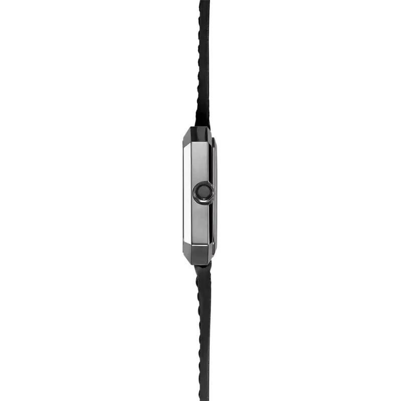 Le bracelet de ce garde-temps apporte une touche de sophistication avec son matériau en cuir de bovin de couleur noire. La surpiqûre ajoutée renforce le bracelet tout en offrant une esthétique soignée et moderne. Celui-ci s'attache facilement au poignet grâce à une boucle ardillon, un type de fermoir simple mais très sécurisé, qui ajoute à la fois un charme rétro et une efficacité évidente.