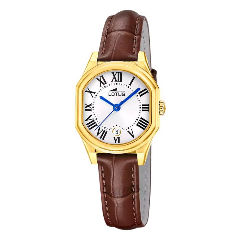 Le bracelet en cuir de bovin à motif crocodile apporte une distinction immédiate à la montre Lotus Old Money. Sa teinte marron riche et profonde s'assortit à la calotte dorée du boîtier. Avec une largeur de 12 mm, le bracelet offre un confort optimal et une adaptabilité parfaite pour un poignet féminin. Le fermoir à boucle ardillon assure une sécurité sans faille, tout en apportant une touche traditionnelle à l'ensemble.