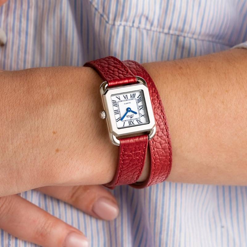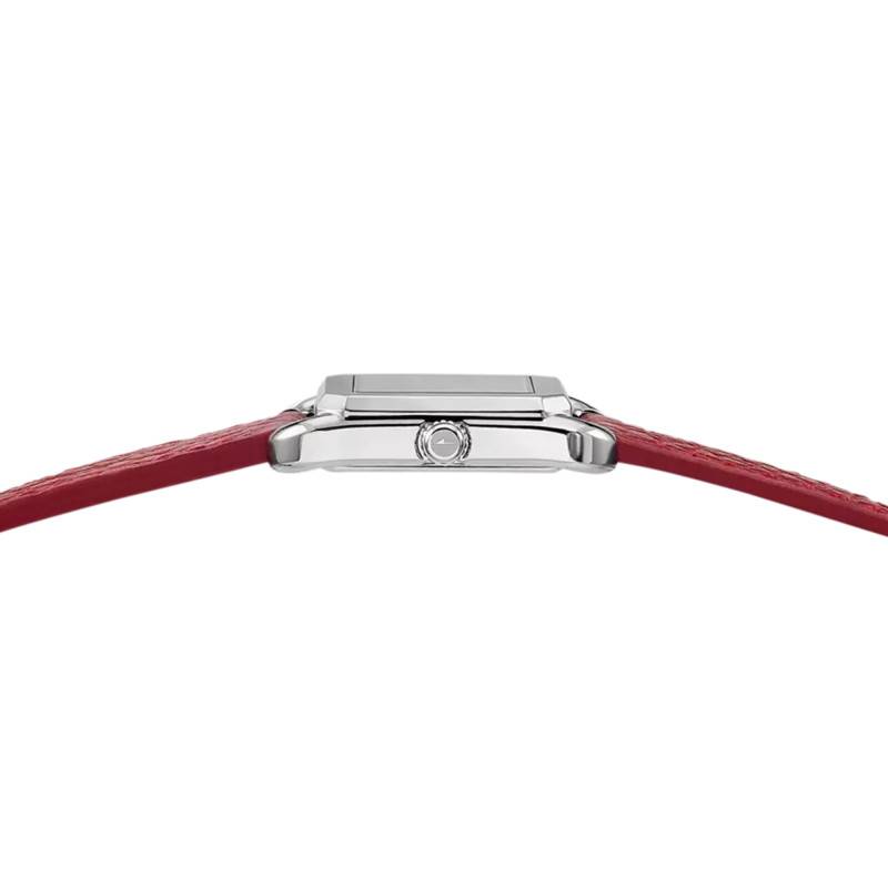 Ce bijou d'élégance est complété par un bracelet en cuir de bovin de couleur rouge, apportant une vitalité attrayante et un confort absolu. Le cuir, choisi pour sa résistance et sa souplesse, est mis en valeur par des surpiqûres qui accentuent l'élégance classique du bracelet. La largeur du bracelet de 14 mm à l'entrecorne garantit un ajustement parfait, conférant un maintien sûr grâce à sa boucle ardillon en acier, facilitant une usage quotidien simple et réussi.