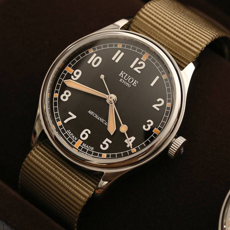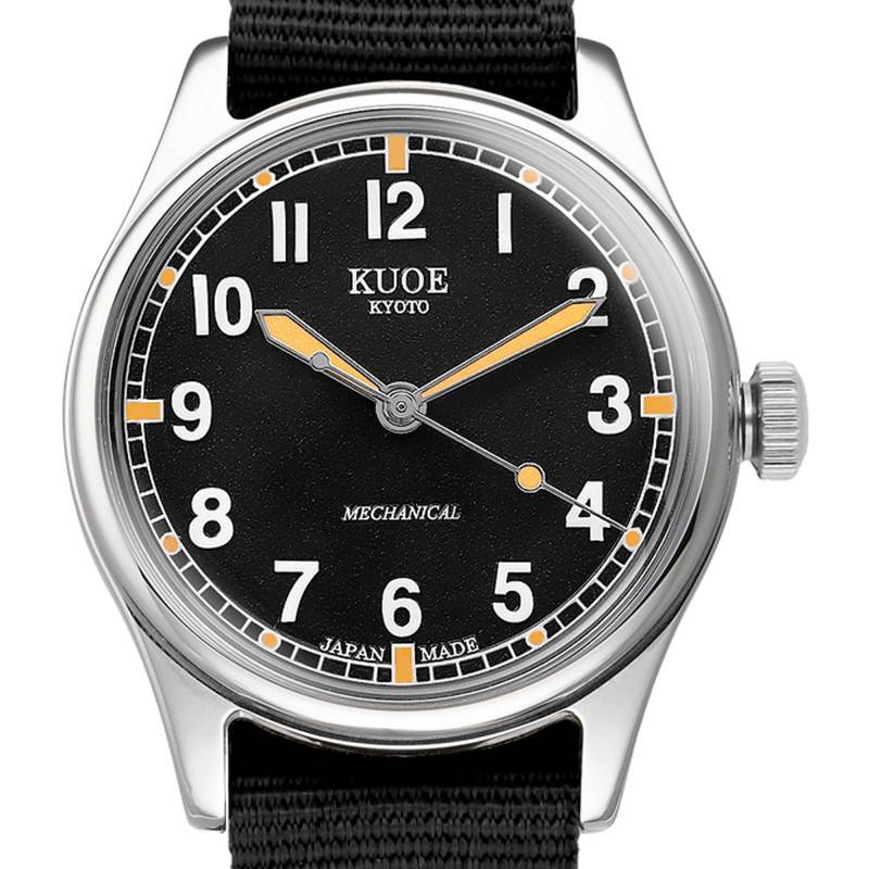 La jeune marque horlogère Kuoe a pu faire parler d'elle en peu de temps, et ce, grâce à son identité et à sa vision uniques qu'elle ne cesse d'insuffler dans des créations élégantes, vintages et modernes dans l'air du temps. Elle présente à tous les amoureux de garde-temps “Made in Japan” des modèles minimalistes qui mettent l'accent sur les designs d'époque avec un esprit Kyoto traditionnel et un meilleur rapport qualité/prix. Provenant de la collection Old Smith 90-002, cette captivante montre os90002-nd-bk-large s'affirme comme le choix idéal de toute personne qui apprécie l'élégance vintage et la sophistication. Cette dernière reprend les codes authentiques des modèles militaires britanniques des années 1940-1970 en y apportant une touche moderne pour s'aligner sur les tendances et les goûts du moment. Elle viendra ajouter une touche de raffinement et d'intemporalité à toutes vos tenues, de la plus formelle à la plus sportive, en vous conférant une allure chic de jour comme de nuit. Ce modèle se présente ici avec une taille plus grande que ses ainés, répondant aux envies des clients de la marque. Aux lignes finement raffinées, son boîtier de forme ronde est réalisé en acier inoxydable 316L avec une finition polie qui lui confère un aspect brillant et épuré. Ce dernier convient parfaitement aux poignets masculins et permet un port à la fois confortable et agréable en toutes circonstances. Pour ce qui est des dimensions, il mesure 38 mm de diamètre et 45 mm de longueur pour une épaisseur de 12 mm. Vous pourrez régler les heures et les minutes par le biais de la couronne vissée qui s'installe à 3h. Cette dernière arbore un design cranté pour une manipulation aisée. Un verre saphir de forme bombée vient se glisser par-dessus le cadran en se dotant d'un revêtement antireflet sur la face intérieure. Celui-ci offre une touche vintage exquise à l'ensemble, une bonne protection contre les chocs et les éraflures du quotidien et une lisibilité optimale de l'heure. Pour finir, le fond de boîte vissé de ce garde-temps lui permet une étanchéité de 10 ATM.