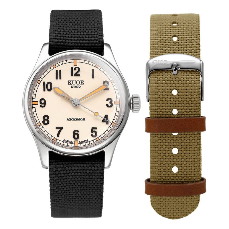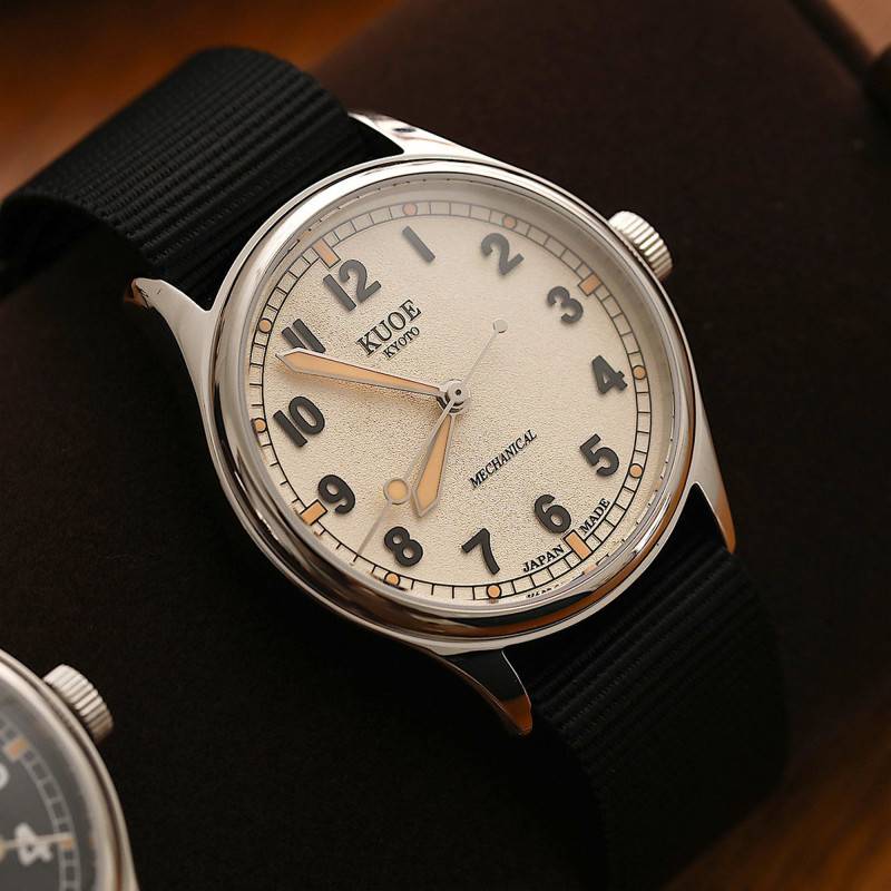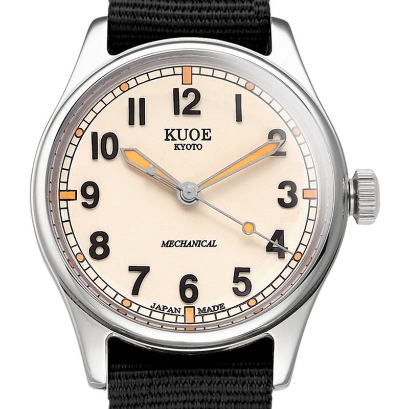 Appuyant le charme vintage et classique de la montre en y apportant une bouffée de douceur, ce cadran rond se distingue par son design texturé et sa couleur crème. Il viendra ajouter une touche raffinée et sophistiquée à votre poignet en permettant une lisibilité impeccable de l'heure sous toutes les conditions. Cela est assuré par ses marqueurs temporels luminescents. Son fond grainé est parcouru par deux aiguilles glaives et par une fine trotteuse “Lollipop” au contrepoids rond. De couleur grise, ces dernières vous communiqueront les heures, les minutes et les secondes, y compris en obscurité grâce à leur revêtement SuperLuminova orange. Elles pointent douze index de couleur noire qui vous aideront à repérer rapidement les heures. Ceux-ci sont présentés par des chiffres arabes et sont entourés par un chemin de fer des minutes marqué dans un style classique. Pour une visibilité accrue, des petits index de formes rectangulaire et ronde viennent se poser de 5 en 5 sur ce dernier en arborant une couche orange de SuperLuminova. Par ailleurs, vous remarquerez à 6h que Kuoe a noté le label “Japan Made” avec un peu haut la mention “Mechanical”, tandis que son nom est apposé sous midi, gage d'authenticité.