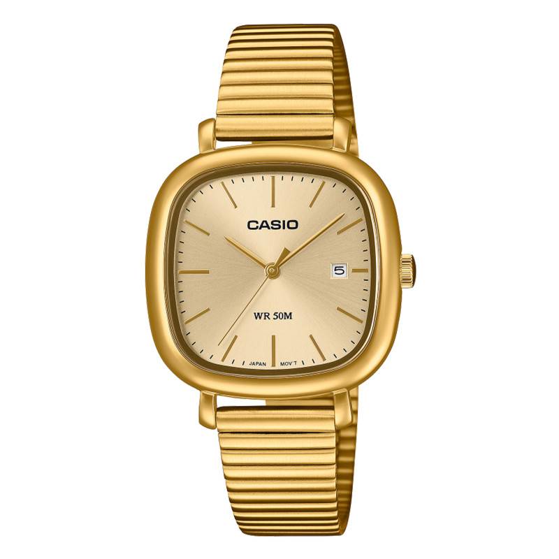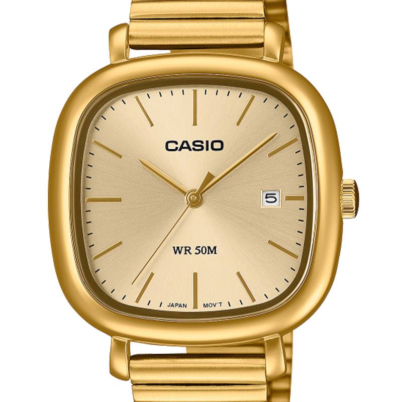 La Montre ovale de Casio Timeless se présente avec une allure indéniablement élégante, propulsée par une fabrication méticuleuse au Japon. Son boîtier ovalisé mesurant 36.7mm de largeur par 30mm de longueur est une parfaite incarnation de sophistication et de design moderne. Conçu en acier inoxydable recouvert d'un traitement PVD doré, il offre une apparence luxueuse tout en garantissant robustesse et durabilité. D'une épaisseur de 7 mm, ce garde-temps affiche une silhouette discrète et confortable sur le poignet, ne pesant que 54 g. On trouve sur son côté droit un unique bouton remontoir permettant de régler l'heure et la date avec facilité.
