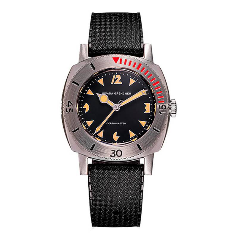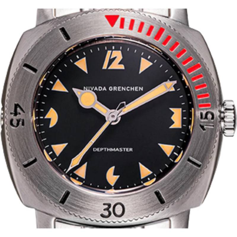 Ce modèle de la maison Nivada Grenchen affiche un design vintage et sportif à la fois. Cette montre est destinée aux fanatiques de plongée car celle-ci peut plonger jusqu'à 1000 mètres de profondeur. Elle est conçue avec un boitier en acier inoxydable 316L d'une dimension de 39 millimètres de diamètres et d'une épaisseur de 13 millimètres. Le verre qui protège ce garde-temps est un verre saphir dur et ultra résistant celui-ci ne court un danger que si vous le frotter à un diamant. Le fond de boite vissé permet à son heureux propriétaire de pouvoir aller dire bonjour à Némo sans mettre en danger le mouvement automatique. Enfin, une couronne vissée à la finition crantée logées à 3 heures vous permettra de régler votre montre en toute simplicité. Cette montre plongeuse accompagnera avec classe votre poignet et sera votre très apprécié lors de vos sorties de plongées.
