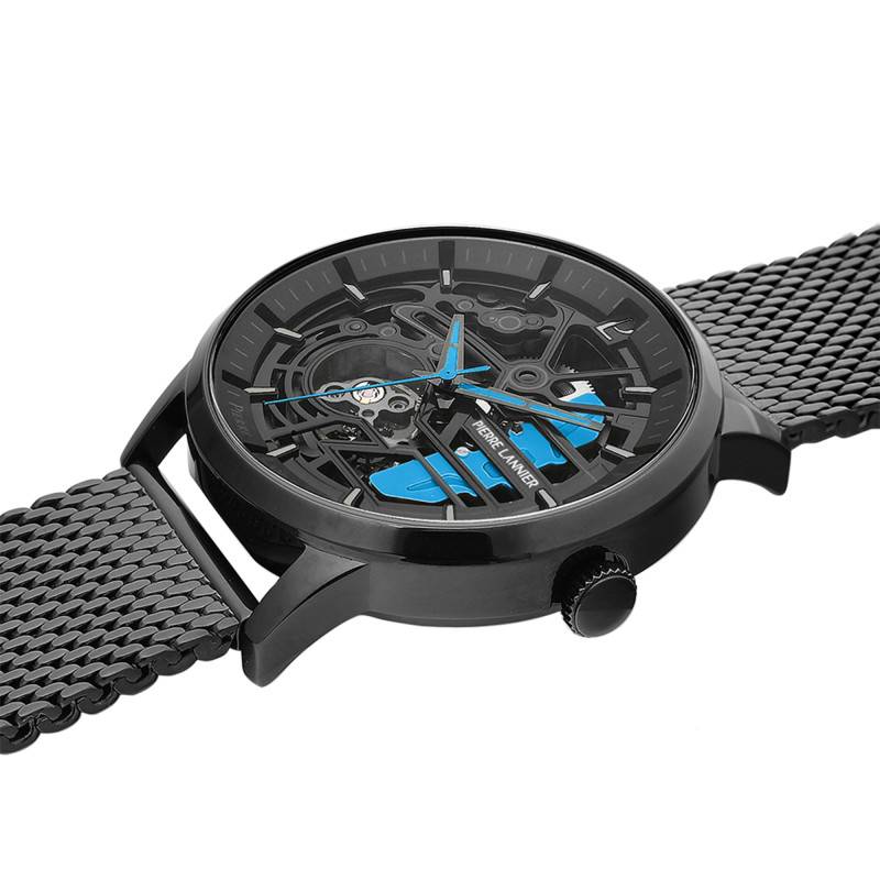 Le cadran est d'une rare sophistication, offrant une finition semi-mat noire qui met en avant son design squelette. Orné d'index fins et d'un chemin de fer, le cadran assure une lecture facile et précise de l'heure. Ce choix judicieux de design joue harmonieusement avec les aiguilles bleues qui indiquent les heures, minutes et secondes, soulignant le caractère résolument moderne et dynamique de cette montre. Les ouvertures soigneusement découpées permettent d'admirer le mouvement automatique Seagull. Le verre minéral plat qui recouvre le cadran aide à maintenir son intégrité tout en accentuant sa beauté épurée.
