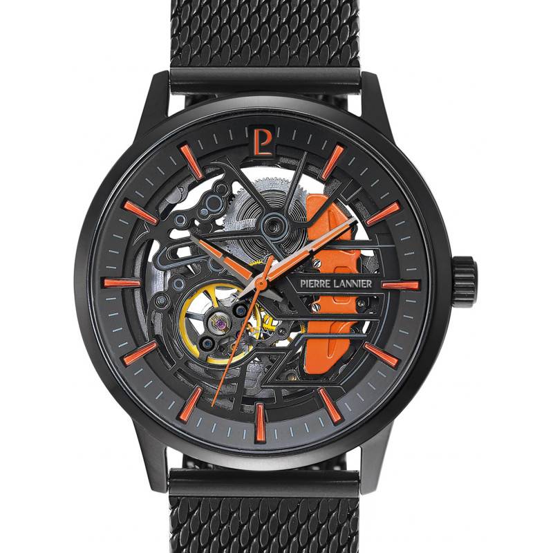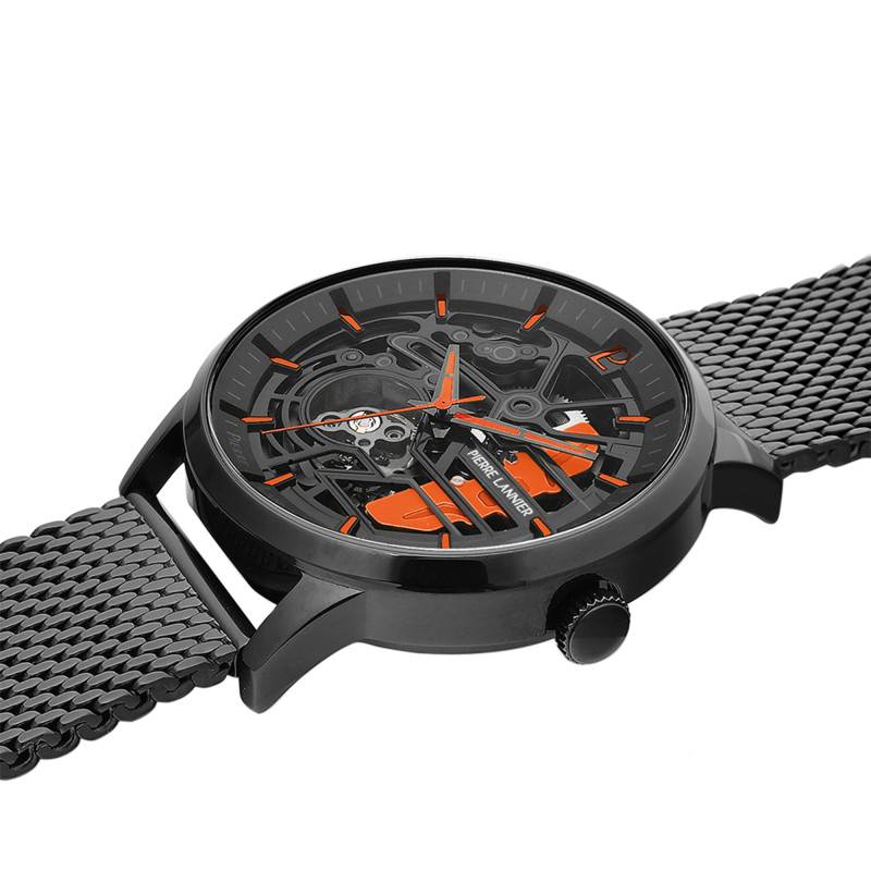 Le cadran largement ouvert de cette montre grâce à sa finition squelette est une véritable fenêtre sur le monde complexe de l'horlogerie mécanique. Fini en noir semi-mat, il capte la lumière de manière subtile, mettant en valeur les nuances de son mécanisme apparent. L'ajout de touches oranges sur les index accentue les éléments visuels du design, facilitant la lisibilité tout en injectant une dose de modernité. Les aiguilles fines oranges en mouvement constant, mesurant les heures, minutes et secondes, soulignent la précision et le soin du détail propres à cette pièce. Un chemin de fer pratique encercle le cadran, guidant subtilement l'œil vers le centre de cette œuvre mécanique. Le verre minéral plat, choisi pour sa robustesse et sa résistance aux rayures, scelle ce cadran de manière protectrice.