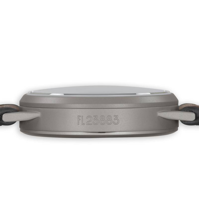 Un bracelet en cuir de veau marron foncé s'accroche au boîtier de cette Paderborn. Deux rivets en acier sablés se posent de chaque côté de l'entre-corne (mesurant 20 millimètres). Les surpiqûres du bracelet sont blanc-crème et apporte une élégance incroyable à cette montre aéronautique.