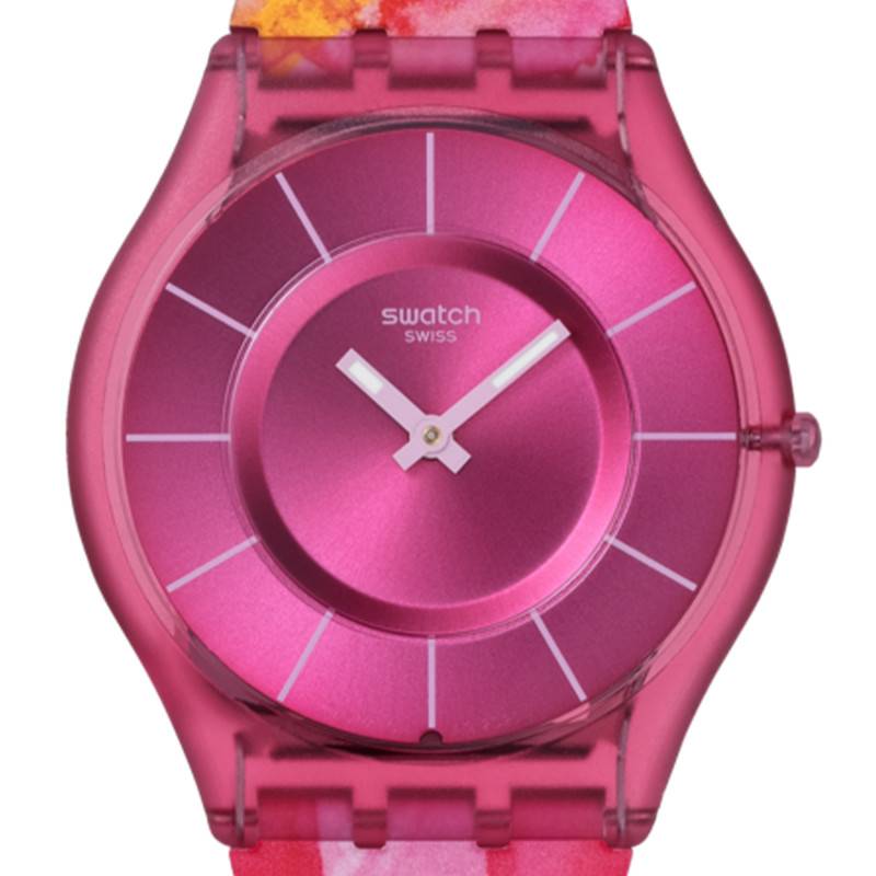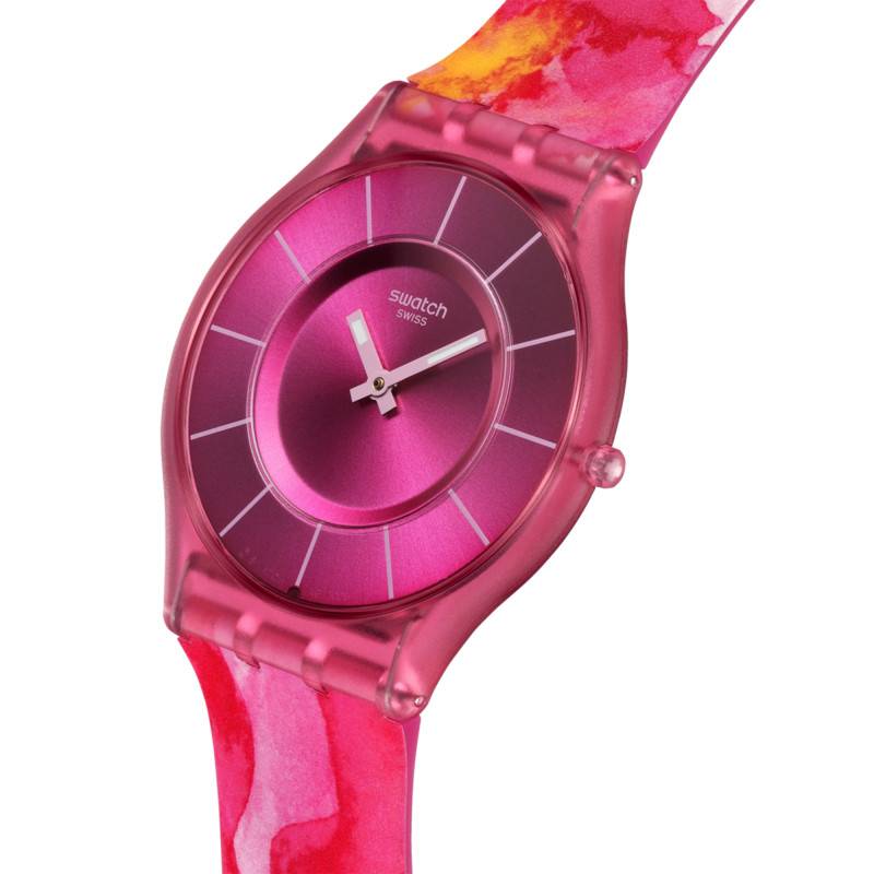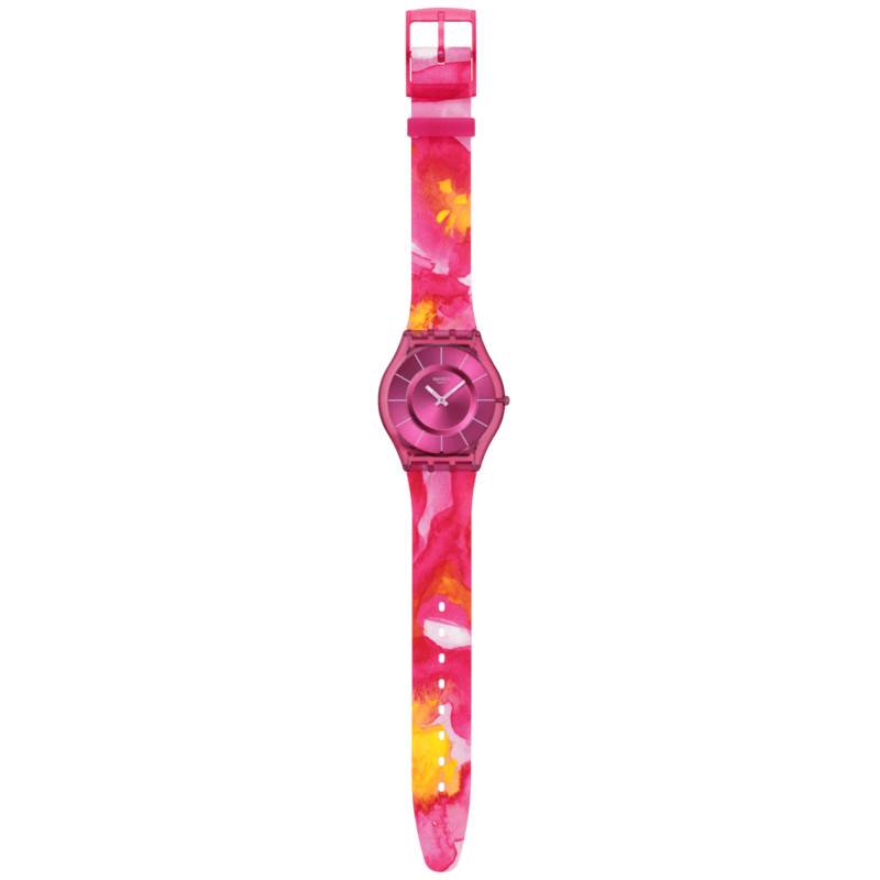 Swatch propose ici un modèle éblouissant avec la Paradise Petals. Ce garde-temps, destiné autant aux femmes qu'aux hommes, combine innovation et design moderne grâce à l'utilisation de matériaux biosourcés. Le boîtier rond est une merveille de simplicité et de style, mesurant un diamètre exact de 34 mm et une épaisseur de seulement 4,30 mm. Cela offre une silhouette fine et légère autour du poignet.