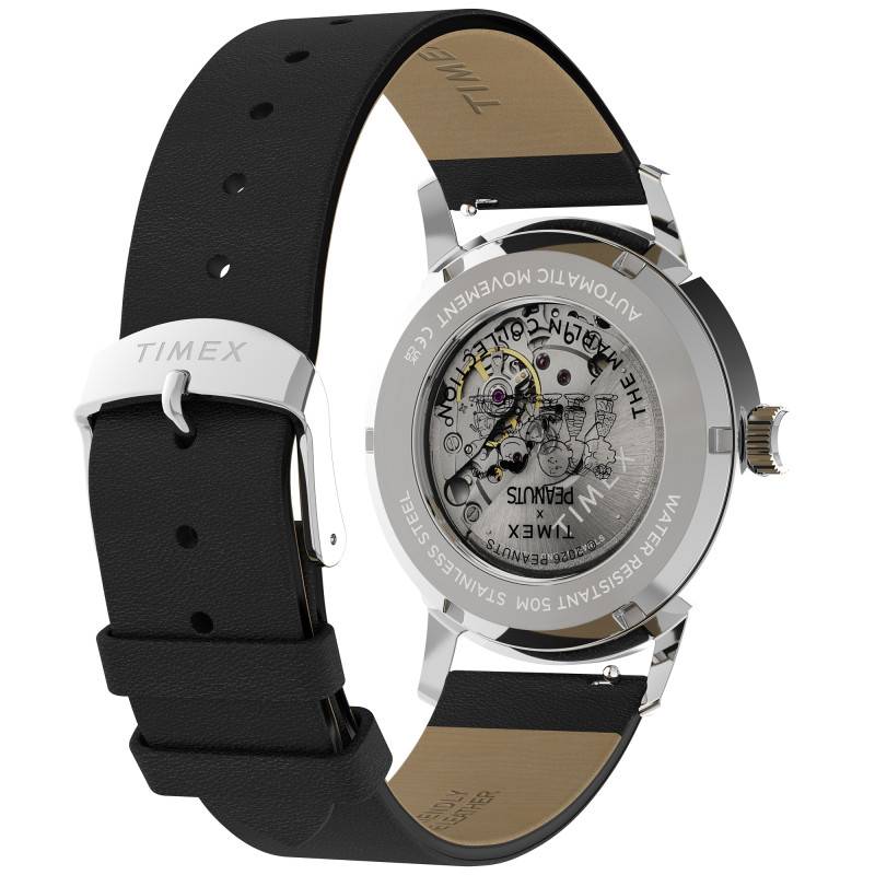 La montre Peanuts x Timex Marlin Automatic Soccer est un parfait exemple de fusion entre design classique et éléments ludiques. Arborant un boîtier rond en acier inoxydable de 40 mm de diamètre, elle incarne la robustesse avec une finition polie/brillante rehaussant son éclat sous tous les angles. D'une épaisseur de 13,50 mm, elle est soigneusement conçue pour offrir un confort optimal au poignet tout en garantissant une présence affirmée et élégante. Le poids du boîtier de 55 g témoigne de la qualité des matériaux employés, notamment l'acier inoxydable, qui assure non seulement la beauté visuelle mais aussi la durabilité. Cette montre se distingue également par un fond de boîte transparent et vissé, permettant d'admirer le mouvement automatique en action tout en assurant l'étanchéité et la protection du mécanisme interne. La lunette en acier inoxydable ajoute une touche supplémentaire de sophistication, renforçant son design sobre et raffiné.