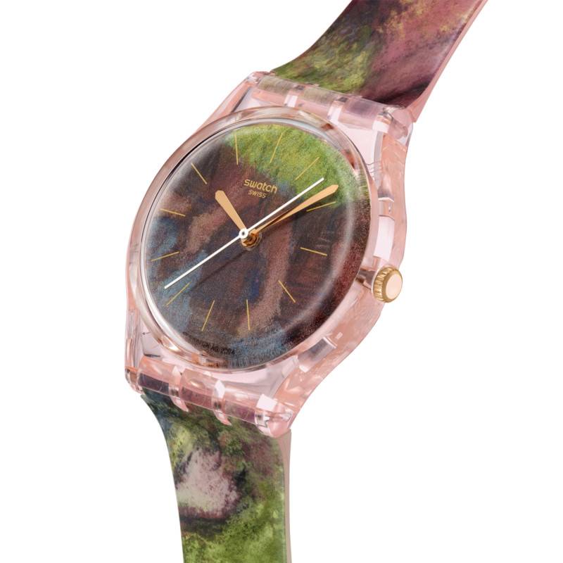 Le cadran de la Swatch Pollock's Alchemy est une véritable œuvre d'art avec sa finition peinte qui pourrait rappeler les coups de pinceau d'Edgar Degas avec son tableau Danseuses vertes et jaunes (1903). Il est doté de trois aiguilles centrales élégantes qui désignent avec précision les heures, minutes, et secondes. Aucune numérotation n'encombre cette surface précieuse, permettant à l'observateur d'admirer pleinement l'œuvre.