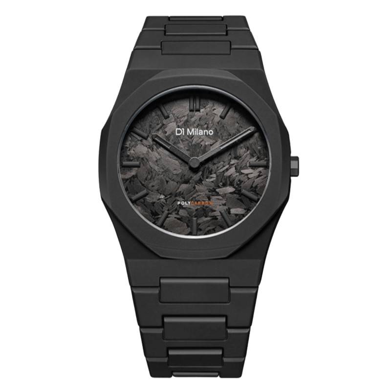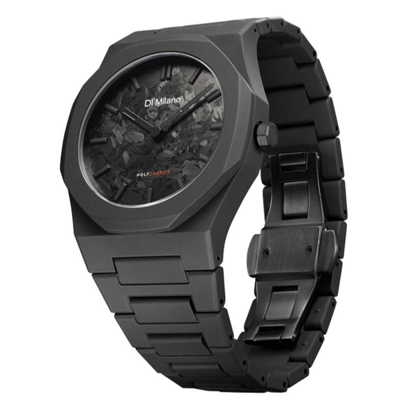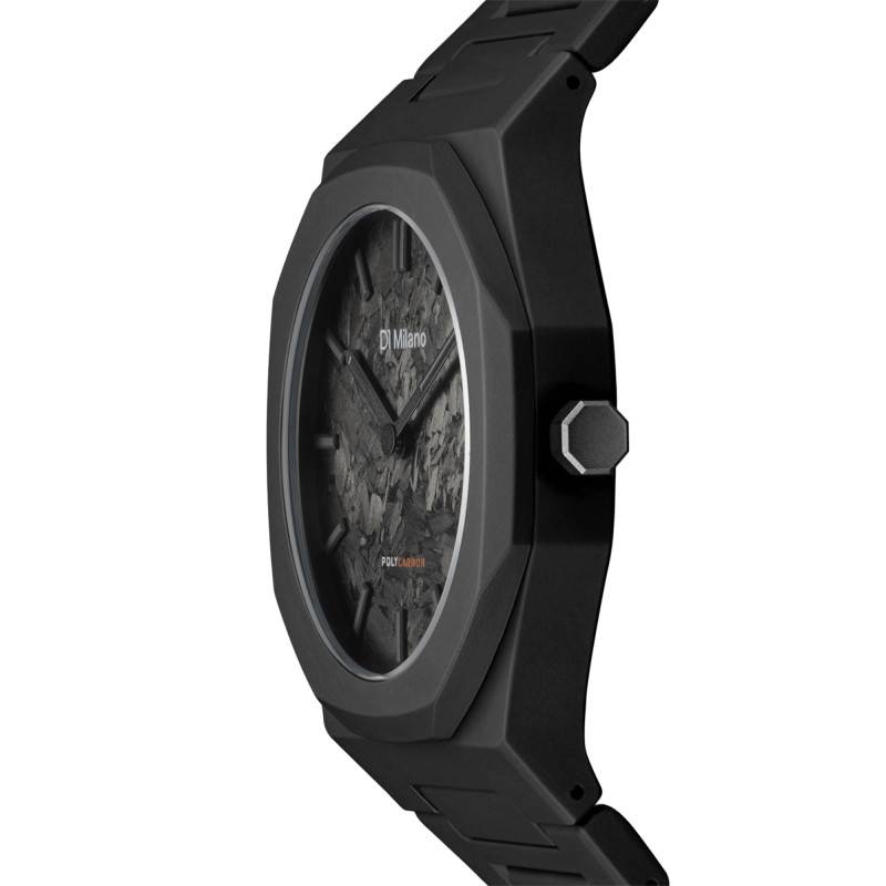 La montre arbore un boîtier octogonal en polycarbonate noir, offrant une légèreté exceptionnelle désormais indissociable des matériaux modernes. Le verre minéral plat, associé à un traitement antireflets, assure une lisibilité optimale en toute condition lumineuse. D'un diamètre de 40,50 mm, ce garde-temps s'adapte parfaitement aux poignets masculins modernes, alliant confort et élégance avec sa touche matte noire des plus élégantes.