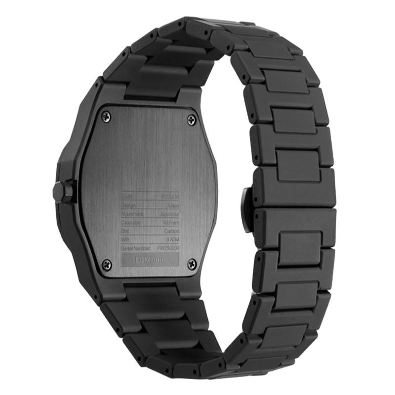 Le bracelet en polycarbonate noir est conçu pour offrir une ergonomie sans compromis. Sa structure légère et sa douceur au toucher garantissent un port agréable tout au long de la journée. La boucle déployante papillon assure non seulement une tenue sécurisée mais renforce également le confort, en s'intégrant naturellement à l'esthétique générale de cette montre. Adapté sur mesure, il assure une parfaite adaptabilité à votre poignet.
