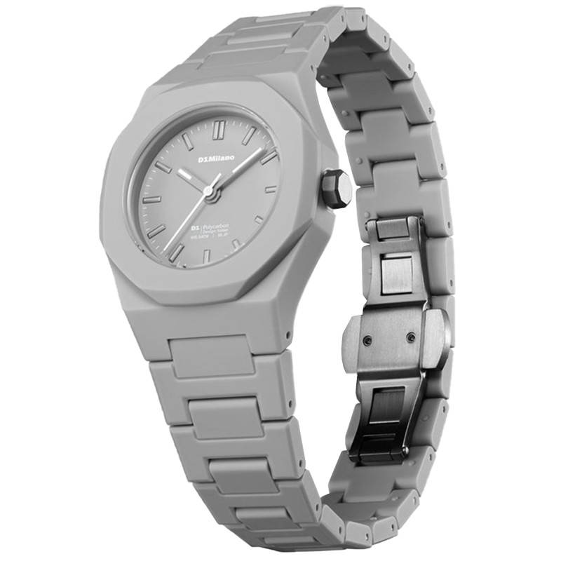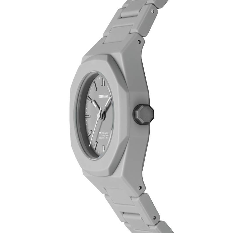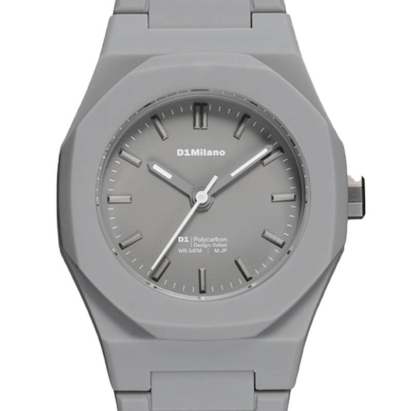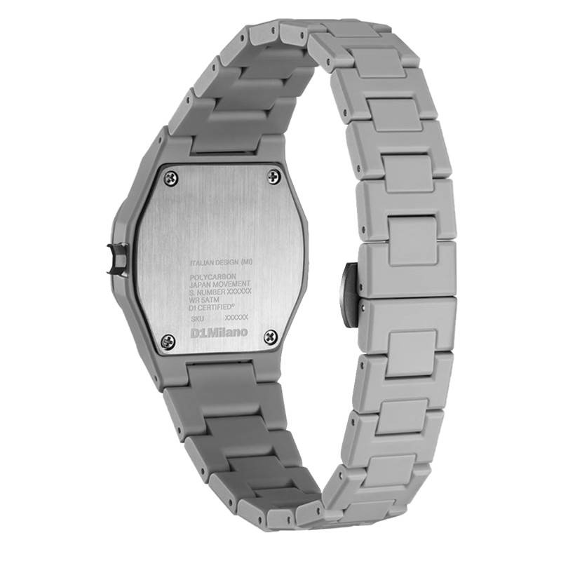 La montre D1 Milano se distingue par son design résolument moderne et minimaliste. Son boîtier octogonal en polycarbonate et acier inoxydable allie robustesse et légèreté, parfaitement conçu pour l'homme contemporain. Avec un diamètre de 32 mm, elle épouse élégamment le poignet. Le fond du boîtier, maintenu par des vis, assure une fermeture sécurisée tout en ajoutant une délicate touche industrielle. Un seul bouton remontoir situé judicieusement facilite le réglage de l'heure avec précision.