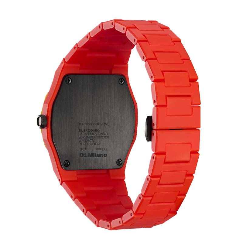 Le bracelet en polycarbonate rouge de ce modèle se démarque par son approche avant-gardiste et son adaptabilité. Le fermoir déployant ajoute une touche de sécurité tout en facilitant la mise en place au poignet.