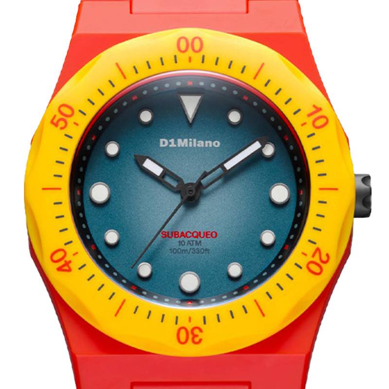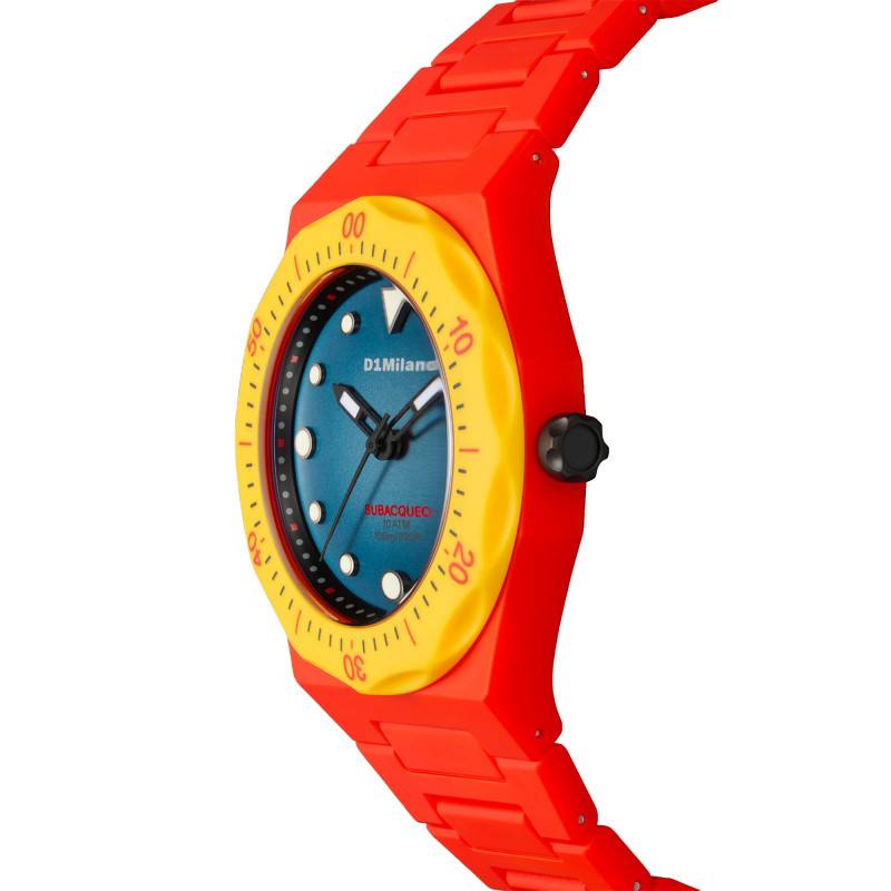 La montre D1 Milano Polycarbon Diver Fire Reef incarne l'esprit vibrant et audacieux avec une esthétique qui ose s'affirmer. Son boîtier rond en polycarbonate offre une légèreté incomparable, pesant seulement 65 grammes, parfait pour un confort au quotidien sans compromettre la solidité. Le choix de ce matériau moderne garantit non seulement une résistance aux impacts mais aussi une finition mate qui accentue le contraste des couleurs vives de la montre. Le diamètre de 40,50 mm assure une présence affirmée au poignet, tout en restant agréable à porter pour différentes tailles de poignets. Le design dynamique est renforcé par une lunette jaune vif qui attire immédiatement le regard, encadrant avec élégance le cadran bleu au cœur de ce garde-temps.