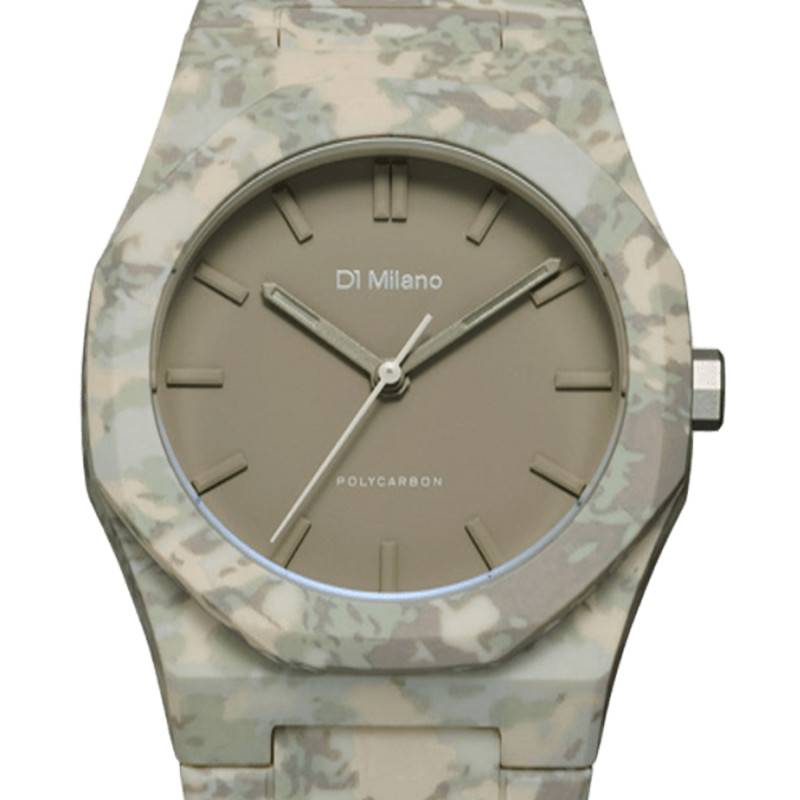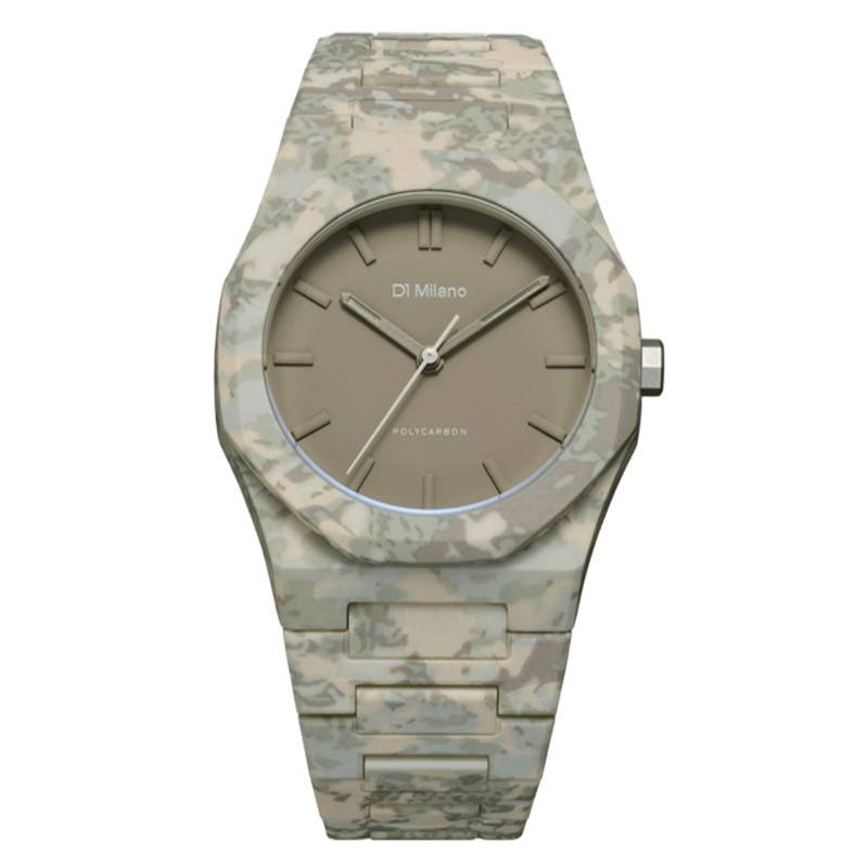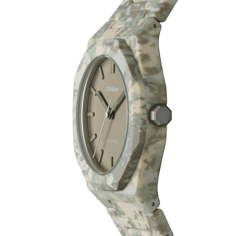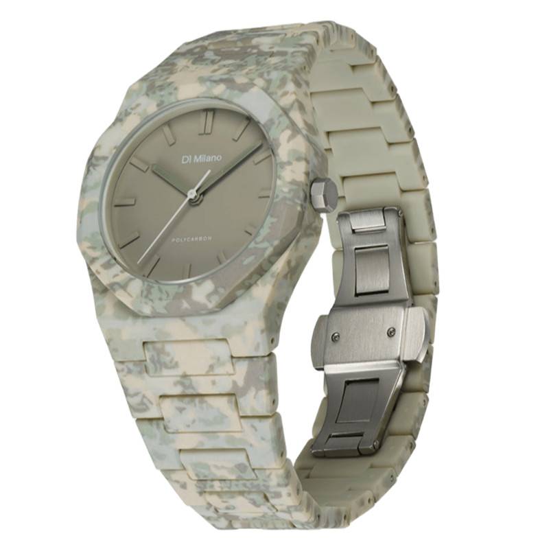 La montre D1 Milano Polycarbon Forest Camo est une fusion impressionnante de technologie moderne et de design audacieux. Le boîtier octogonal unique de 40,50 mm est fabriqué en polycarbonate, un matériau reconnu pour sa légèreté et sa résistance. Son motif camouflage, intégré dans la teinte verte, ajoute une touche distinctive qui capte immédiatement le regard. Associée à un verre minéral plat, cette montre offre une robustesse optimale pour un usage quotidien. Le fond de la boîte, fixé par des vis, assure une excellente protection du mécanisme tout en renforçant l'élégance de l'ensemble.