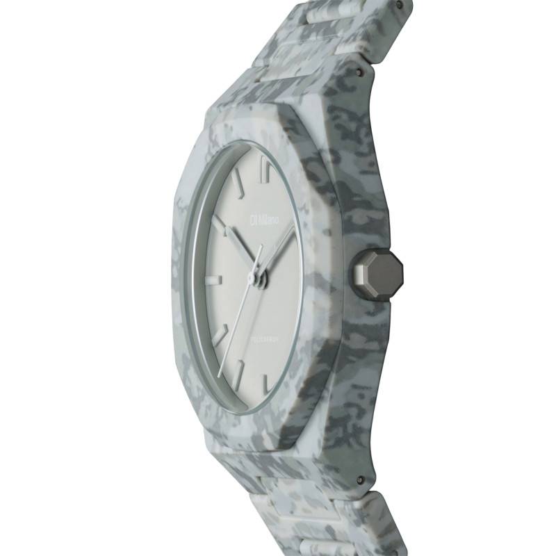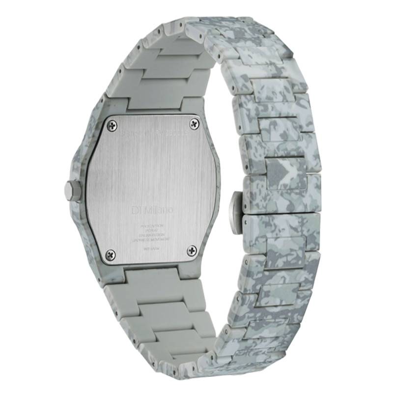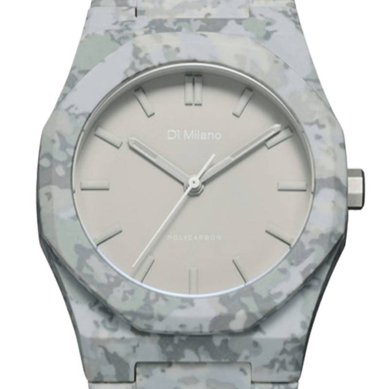 La montre D1 Milano Polycarbon Urban Camo est une création horlogère exceptionnelle qui séduit par son esthétique contemporaine et son design audacieux. Conçue pour les hommes qui ont un sens de la mode affirmé, cette montre allie parfaitement fonctionnalité et style. Le boîtier octogonal de 40,50 mm de diamètre est fabriqué en polycarbonate, un matériau synthétique connu pour sa légèreté et sa résistance, garantissant une durabilité sans compromis. Cette structure est enveloppée dans un motif camouflage avec différentes teintes de gris distinctives, conférant à cette montre une allure moderne et urbaine. Dotée d'un fond maintenu par des vis, cette montre promet une robustesse et une fiabilité accrues, adaptées aux exigences actuelles d'un mode de vie actif et dynamique.