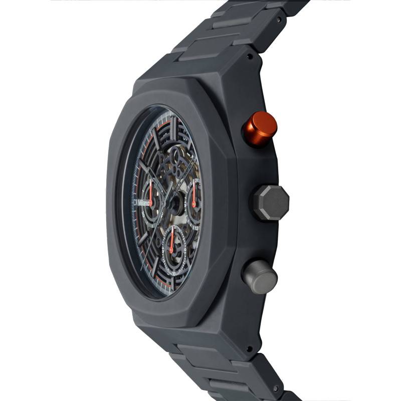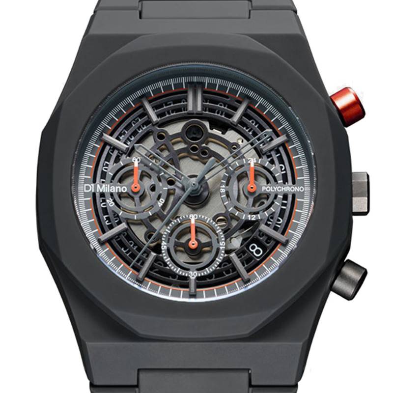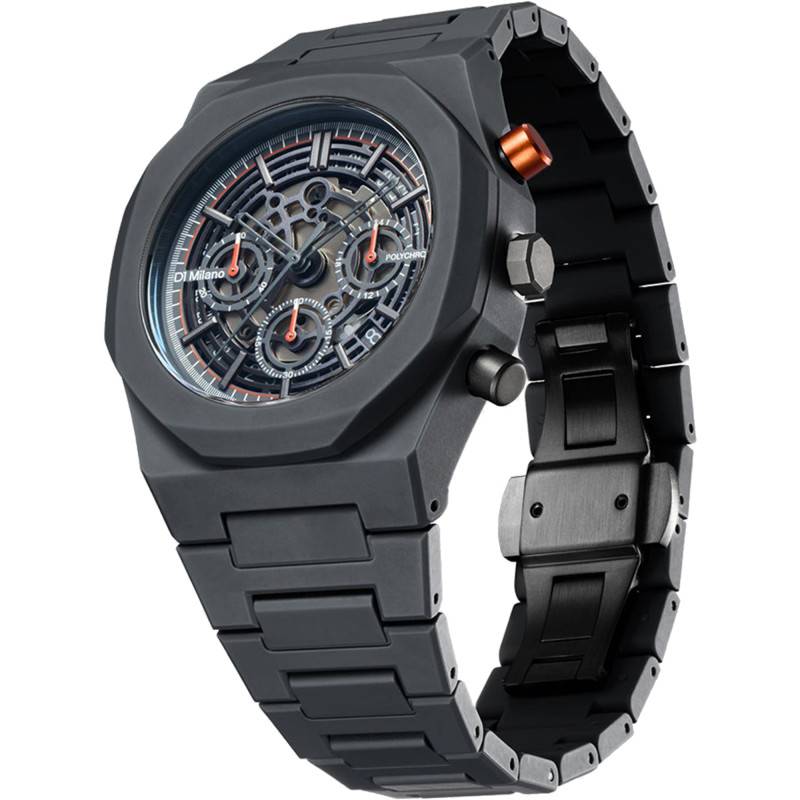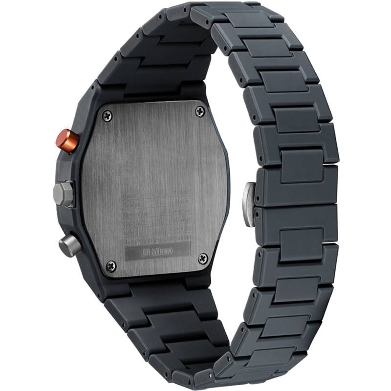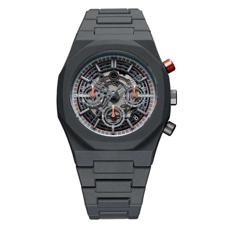 La montre Polychrono Haste de D1 Milano incarne une symbiose parfaite entre design contemporain et fonctionnalité avancée. Conçue avec soin, cette pièce horlogère révèle un boîtier au design octogonal unique en polycarbonate. Le poids de 55 g assure un confort inégalé au poignet, tandis que son diamètre de 40,50 mm convient parfaitement à la plupart des poignets masculins. La conception robuste est parachevée par un fond de boîte maintenu par des vis, démontrant un souci du détail et une qualité supérieure.