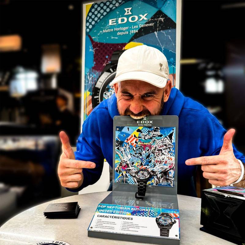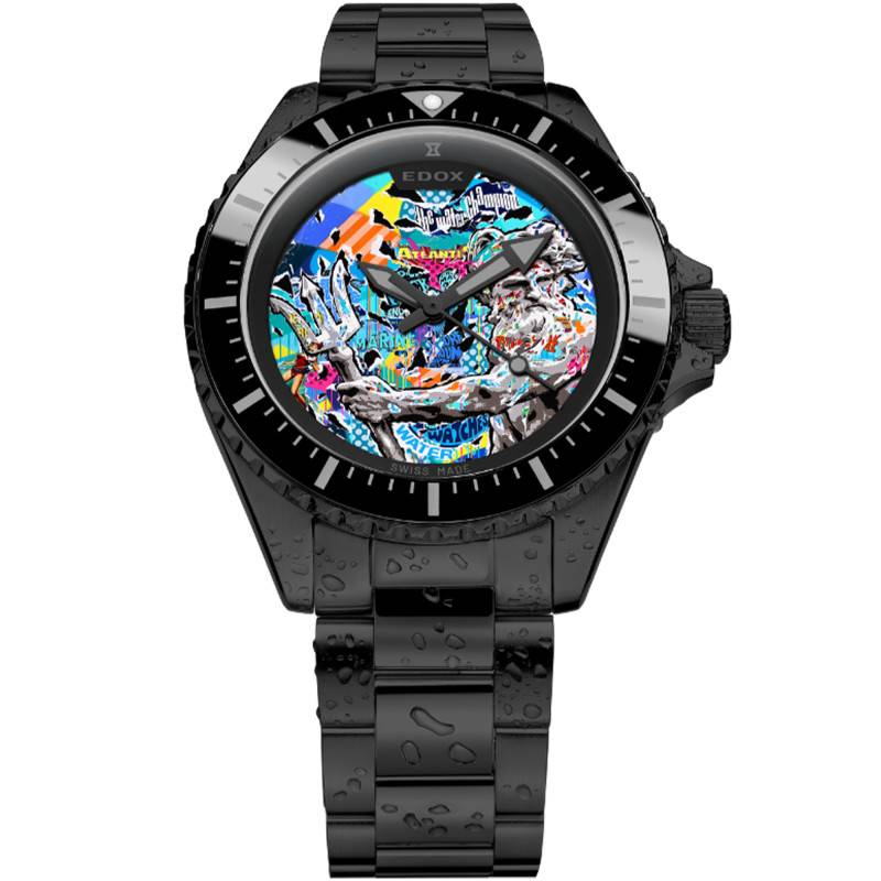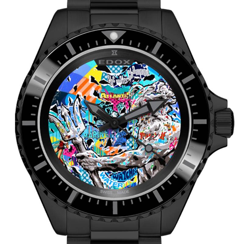 Le cadran est une œuvre d'art en soi, une explosion de couleurs qui transforme la montre en une galerie portable. Réalisé par l'artiste français Jo Di Bona, pionnier du « Pop Graffiti », le design est un collage captivant qui mêle art urbain et culture pop. La finition peinte évoque un monde sous-marin vibrant et énergique, contrastant avec l'harmonie sereine du dieu Neptune. Les aiguilles luminescentes sur le cadran assurent une lisibilité parfaite, même dans les environnements les plus sombres. L'utilité du verre saphir résistant aux rayures magnifie encore plus cette prouesse artistique. Le cadran est non seulement un hommage à l'art contemporain, mais aussi une connexion audacieuse entre le passé et le présent, incrustée de fragments de journaux vintage et de publicités Edox historiques.