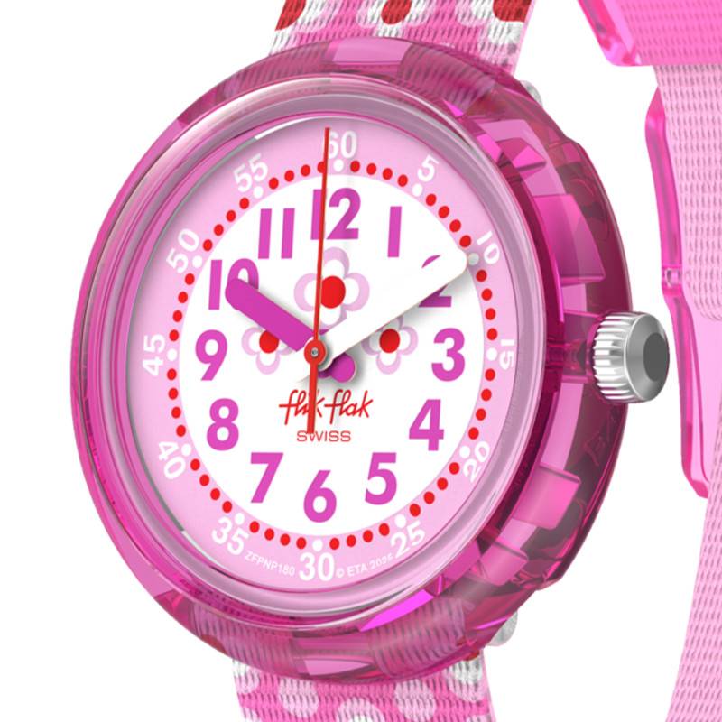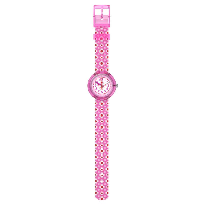 Le bracelet de la Power Flower est conçu en PET, un matériau non seulement robuste mais aussi soucieux de l'environnement. Ce choix met en avant la sensibilité écologique de la marque Flik Flak, tout en garantissant une résistance à l'usure quotidienne. La couleur rose, harmonieuse avec celle du cadran, s'accompagne d'un superbe motif de fleurs blanches qui parcourt l'ensemble du bracelet. La fermeture se fait par une boucle ardillon, simple d'utilisation et sécurisante pour un maintien optimal.