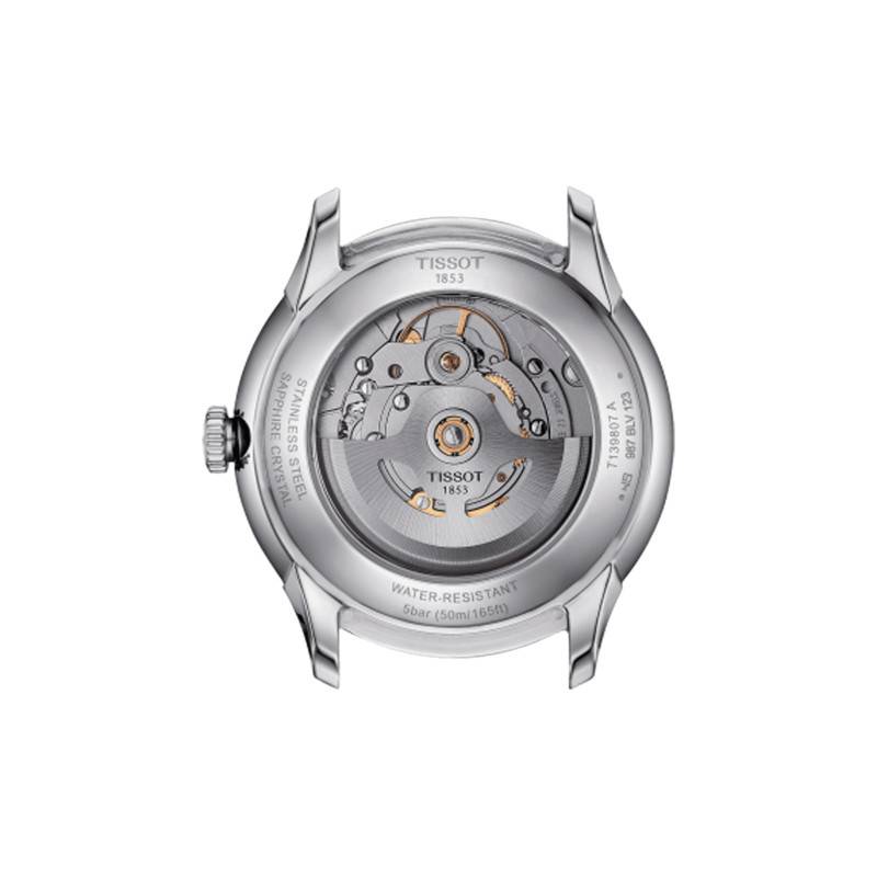 Depuis 1853, la marque suisse Tissot offre une large gamme de produits qui permet à ses clients de créer des souvenirs pour chaque étape importante de la vie. Précision et détermination infaillible, sont les valeurs qui caractérisent cette marque qui vous propose des garde-temps qui vous correspondent à vos besoins. Dans la collection “Tissot Chemin des Tourelles”, se cache cette sublime montre Powermatic 80 de référence T139.807.11.048.00. Elle est munie d'un boîtier argenté, en acier inoxydable 316L de 122 grammes. De forme ronde, ce dernier est surplombé par un verre saphir bombé très résistant qui protège le cadran. Ce verre est inrayable et possède un revêtement anti-reflet. Les dimensions de ce boîtier sont de 39 millimètres de longueur, 39 millimètres de largeur, et 11.22 millimètres d'épaisseur. Celles-ci sont tout aussi bien adaptées aux hommes qu'aux femmes. Pour vous permettre de régler les différentes fonctions de cette montre, une couronne crantée arborant le logo de la marque est installée à 3 heures. Son fond de boîte transparent vous laisse entrevoir le mécanisme, tout en assurant une étanchéité de 5 ATM.